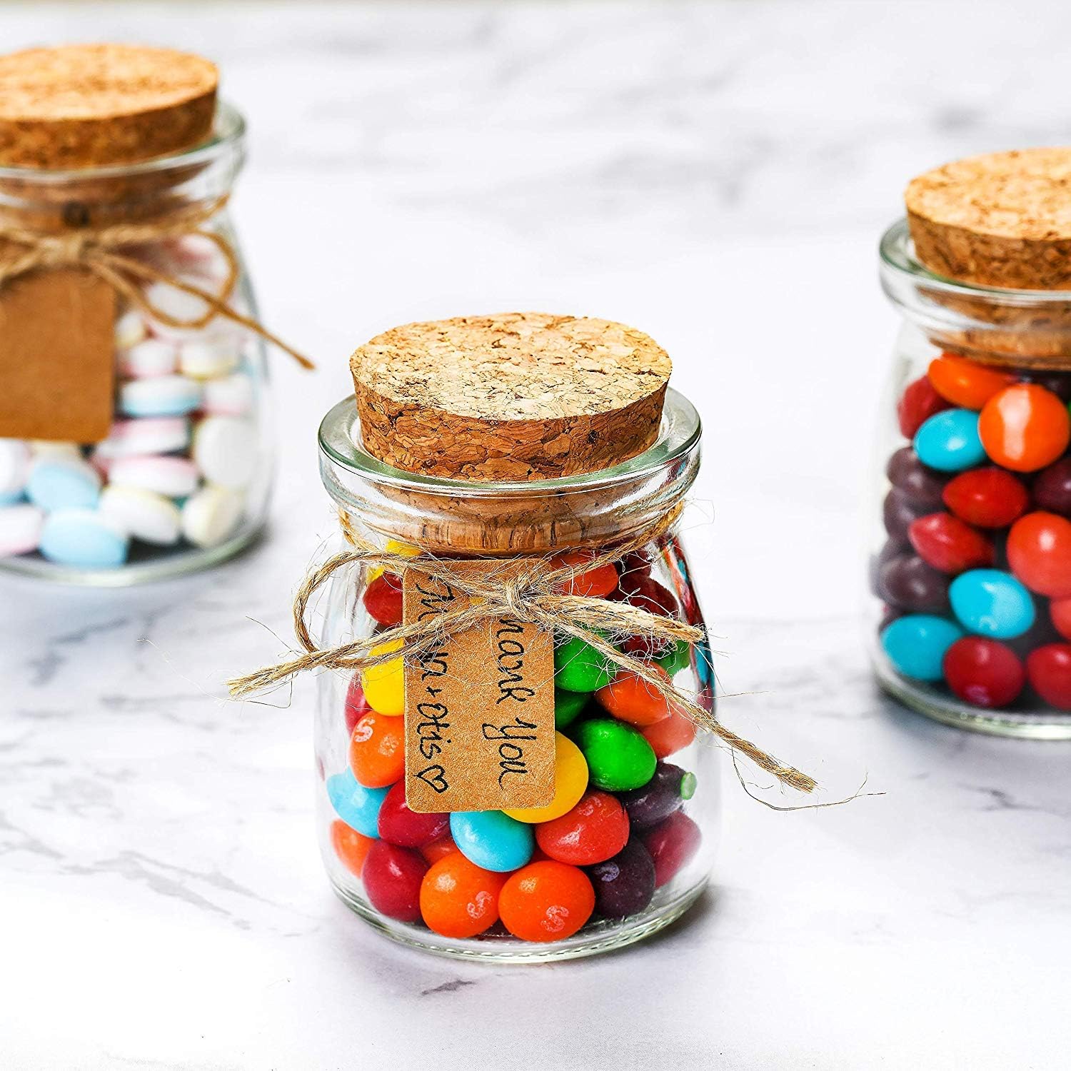 - ADDED LABELS - Perfect for gift bags and party favors, these little glass jars come with 20 brown paper labels and a bundle of twine to add a personalized touch to every bottle!