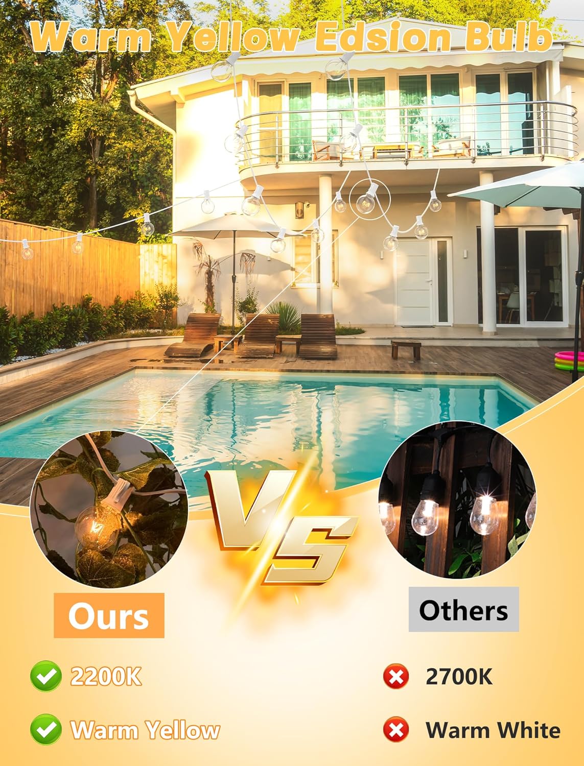 - š” Installation Suggestion of String Lights: Empty sockets be firstly and then install bulbs. Every bulbs should be separated, just in case high wind cause two bulbs too close to broken. Bulbs are glass fragile goods, please take it lightly. Do avoid hanging the string lights on outdoor when rainy or windy so as to prolong service life. For G40 replacement bulbs, pls search "B076MNN2D3".