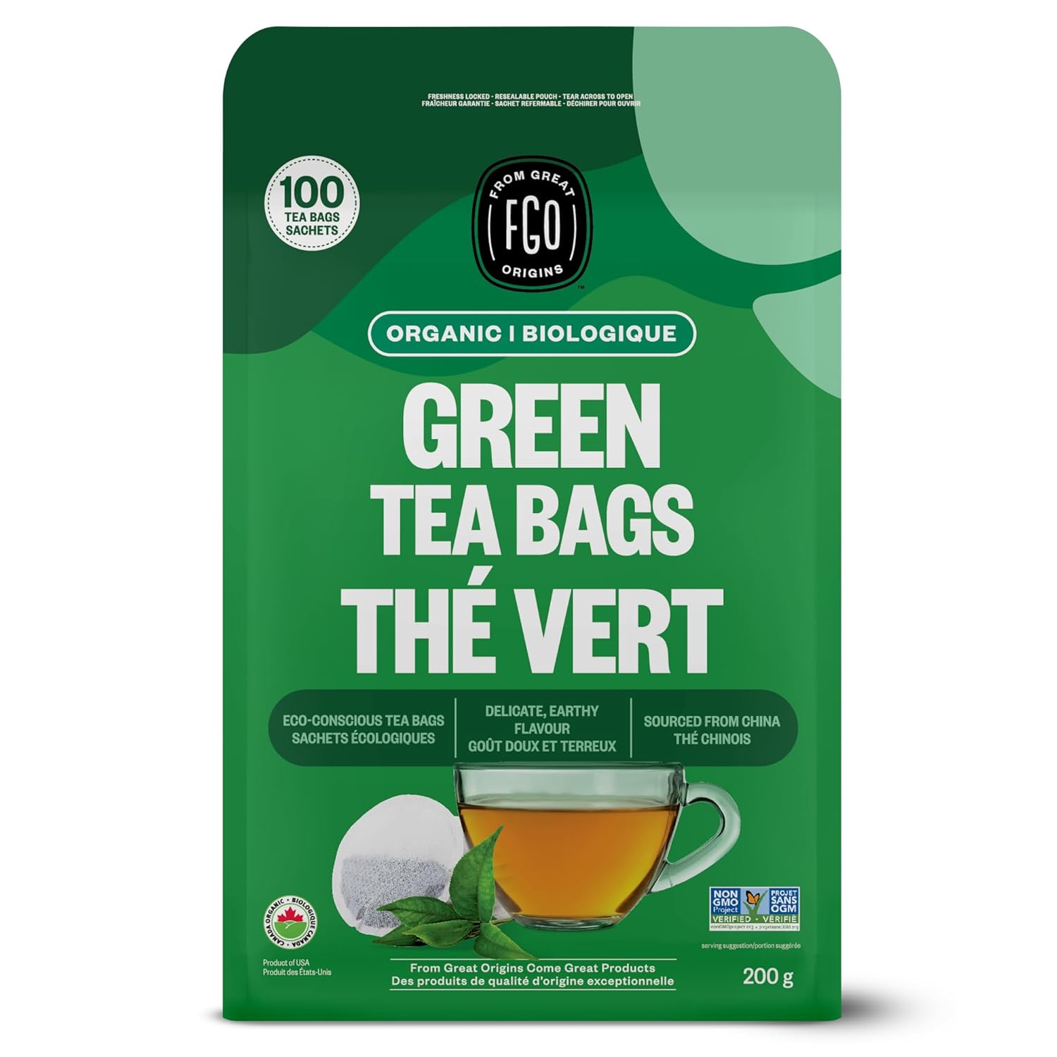 FGO Organic Green Tea, 100 Count Eco-Conscious Tea Bags, Caffeinated, Resealable Pouch, Packaging May Vary (Pack of 1)