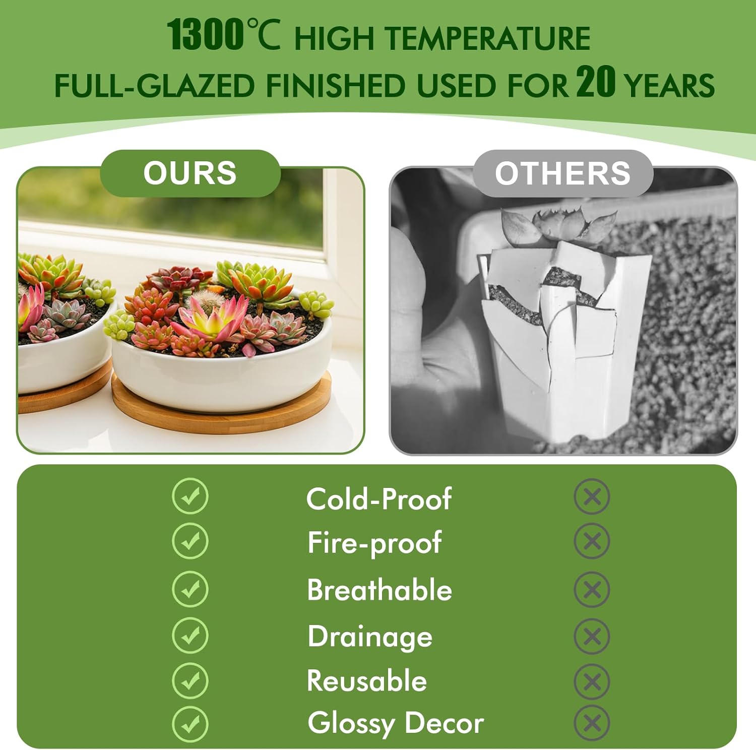 - Succulent Pots Great Value:2-pack shallow succulent pots with drainage and bamboo tray are ideal for small greenery,succulents,cactus,herbs,or flowers.A great way to bring a touch of nature to your indoor spaces.(Plants not included)