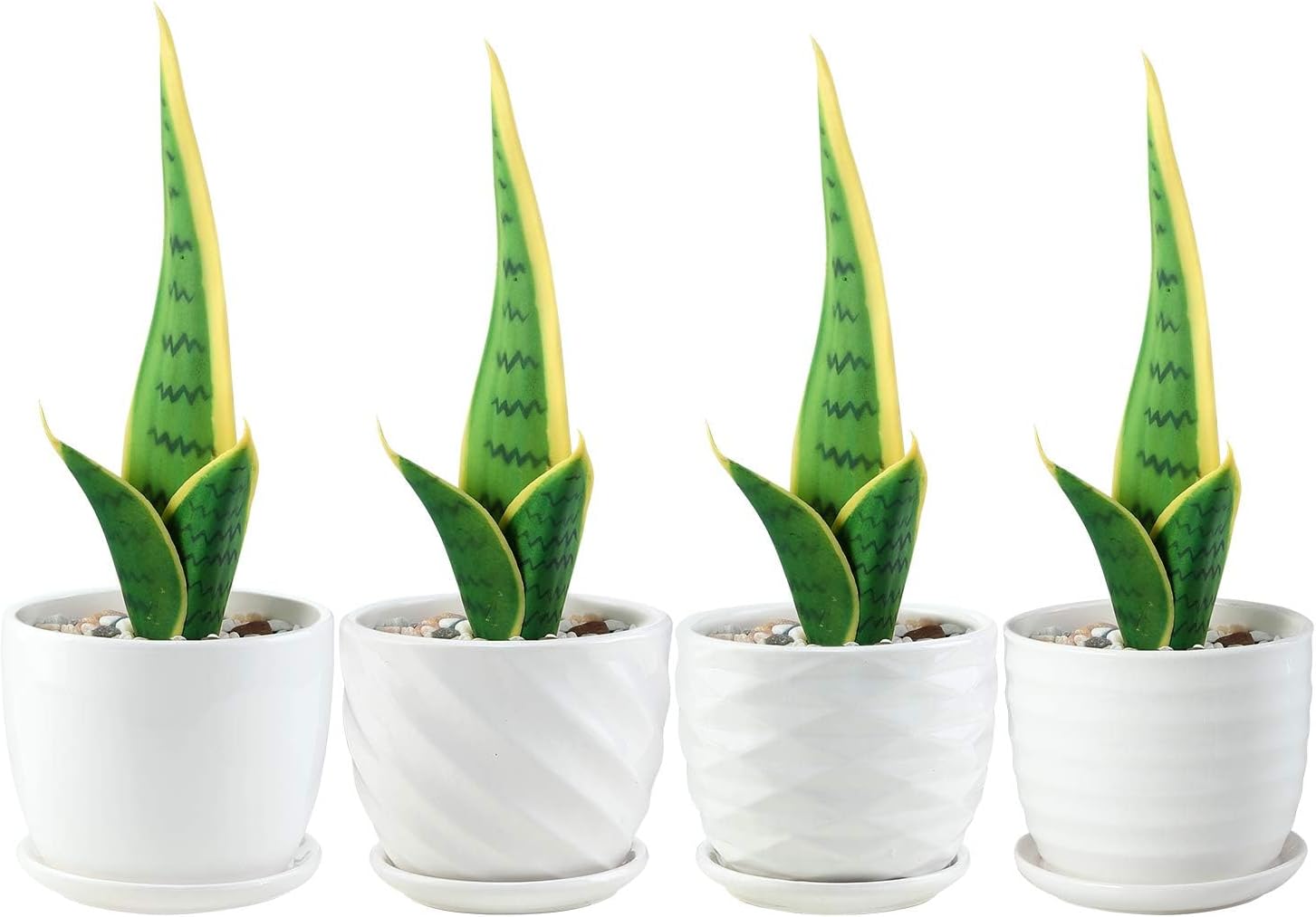 - Cylindrical ceramic planter pots with attached saucer in white color, set of 4