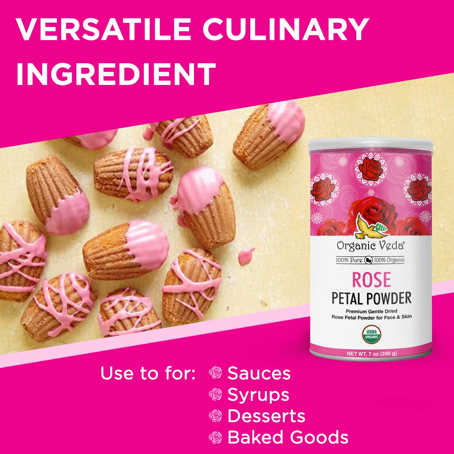Organic Veda Edible Rose Petal Powder - Organic Rose Petal Powder for Cooking, Herbal Tea, Smoothies, Toppings - Natural Rose Petal Powder for DIY Face Masks, Skin & Hair Care - Vegan, No Gluten - 7oz