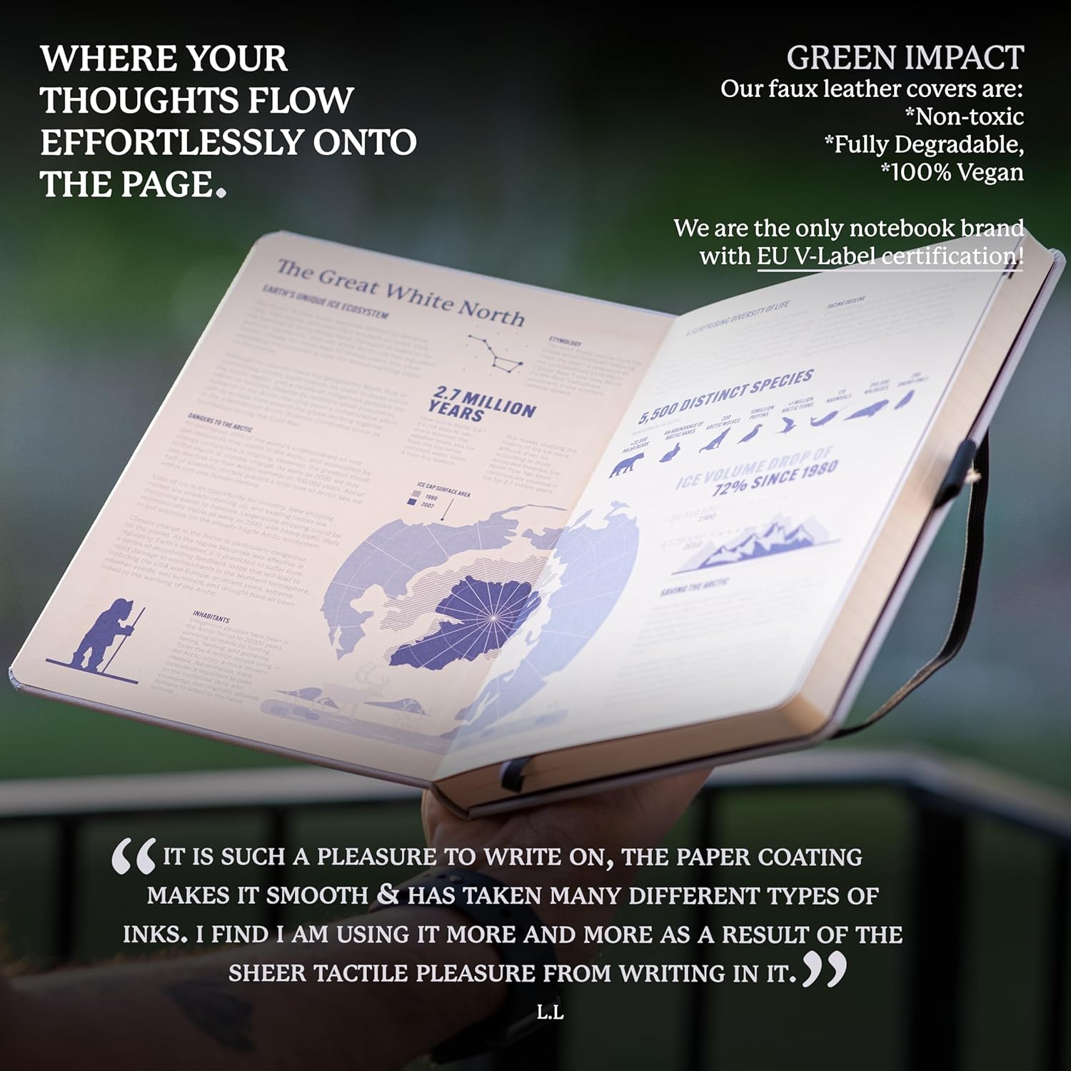 - A5 NOTEBOOK WITH LOTS O' FEATURES: Dingbats notebooks ooze quality - this hardcover bound leather notebook is crafted with PU vegan leather, micro-perforated cream 100gsm pages, an elastic closure and pen holder. It's complete with a silhouette of the Arctic, an infographic spread about the endangered region in the endsheets and an inner pocket for a little added detail - the perfect gifts for men and women, these travel essentials are a gift that keep on giving
