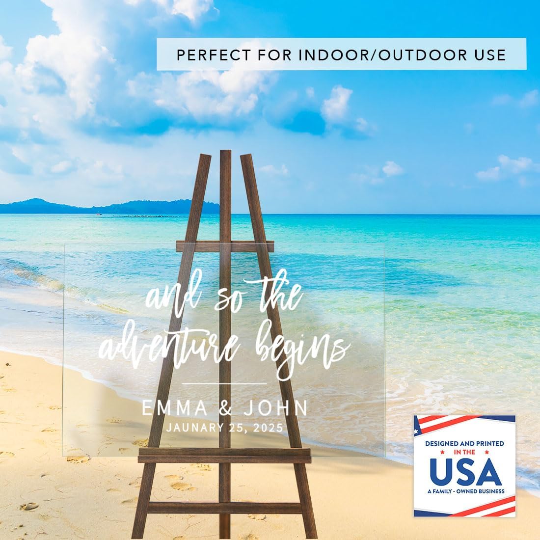 - VERSATILE DISPLAY OPTIONS Your custom names and date are directly printed onto durable acrylic with premium fade-resistant inks. Your sign is peel-proof and smudge proof. Made in USA. Our wedding entrance sign fits all sturdy easels or stands, making this wedding welcome sign without stand perfect for both indoor and outdoor use.