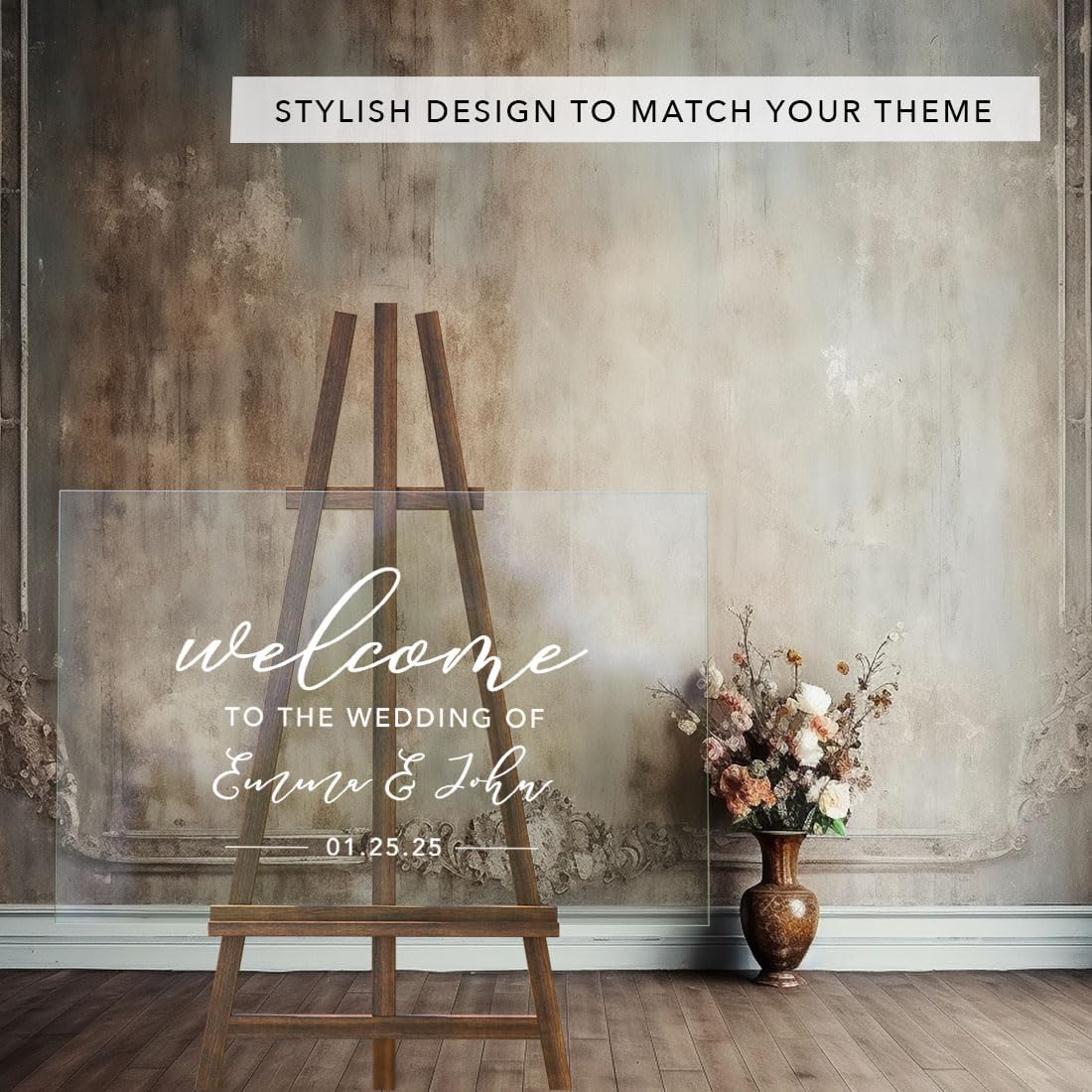 - ACRYLIC WELCOME SIGN FOR WEDDING Personalize your celebration with a personalized welcome wedding sign. The couples custom names and dates blend seamlessly with the overall design, creating a unique welcome to our wedding sign. This durable large acrylic wedding sign measures 16 x 24 inches and is a thick 3 mm.
