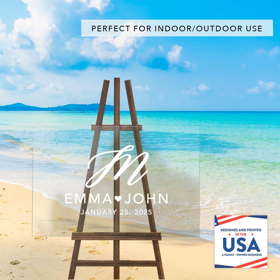 - VERSATILE DISPLAY OPTIONS Your custom names and date are directly printed onto durable acrylic with premium fade-resistant inks. Your sign is peel-proof and smudge proof. Made in USA. Our wedding entrance sign fits all sturdy easels or stands, making this wedding welcome sign without stand perfect for both indoor and outdoor use.