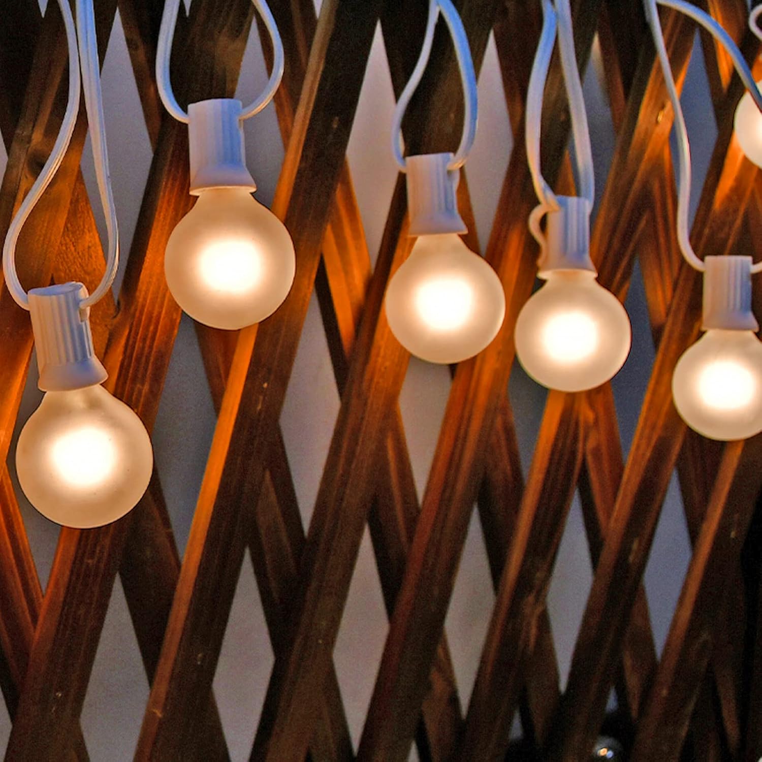 - Globe String Lights: 25ft frosted globe string lights on a white wire, 27 frosted G40 globe bulbs (2 spare). This waterproof patio Lights built-in fuse for safety and the male plug contains a spare fuse. Warm white frosted bulbs light string cast a romantic atmosphere