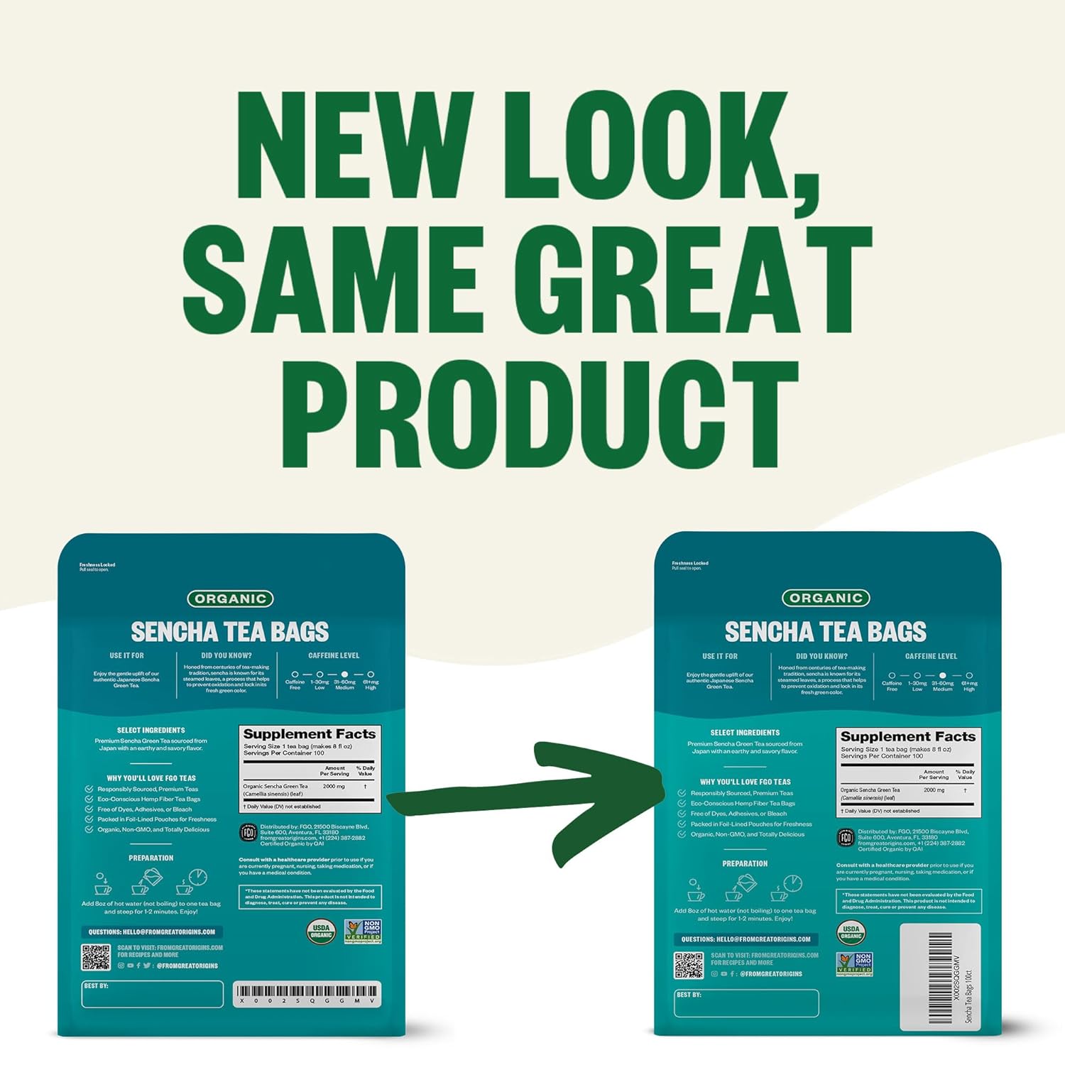 FGO Organic Sencha Green Tea, 100 Count, Eco-Conscious Tea Bags, Resealable Bag, Sourced From Japan, Packaging May Vary (Pack of 1)