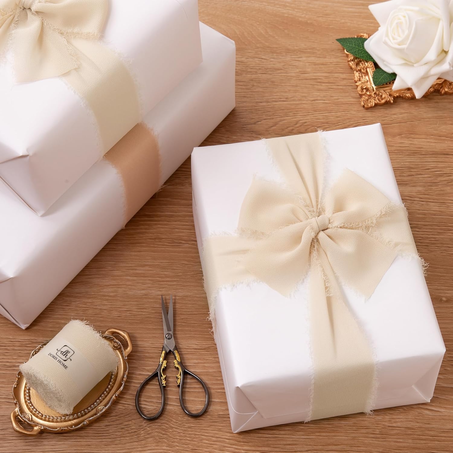 - 【Usage Tips】In some situations, ironed chiffon silk ribbon performs better. Use a low heat iron if needed. Since all fabric ribbons are handmade from natural materials, loose threads may shed from the unfinished frayed edges. Simply trim the loose threads with scissors.