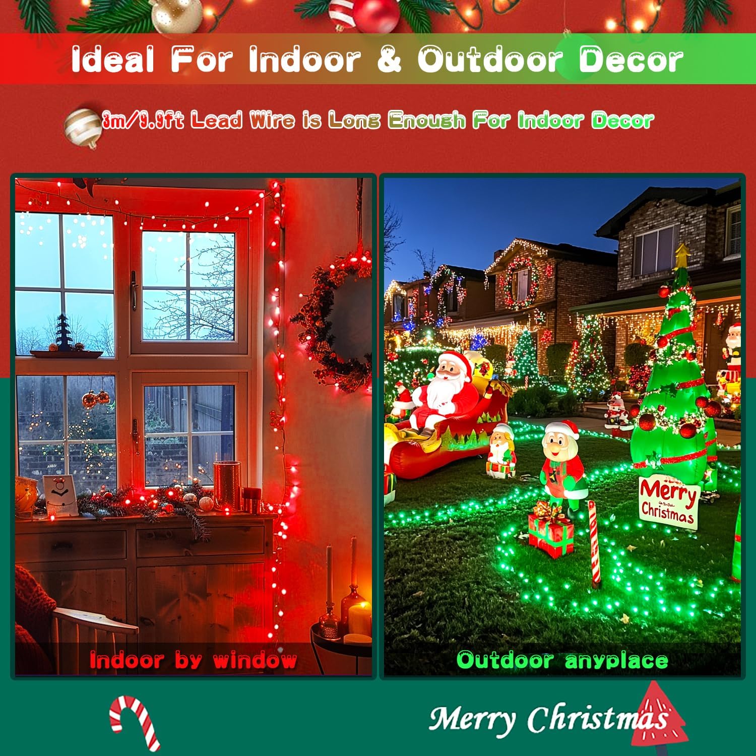 - Widely Used Solar String Lights: Nothing can compete with lightings when it comes to atomosphere building! You definately need our red and green string lights to decorate every part of your home for Christmas! The solar string lights is long enough to apply on diverse outdoor scenes such as yard, patios, porches, gardens. More surprisingly! The leading wire is 3m/9.9ft long, so you can put the solar panel near window to absorb the sunlight. Indoor decoration is also great