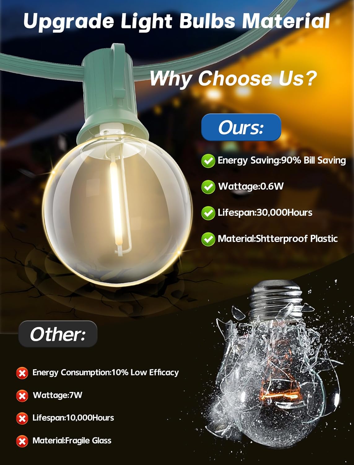 - Shatterproof & Dimmable: G40 LED Christmas lights are made of plastic which much shatterproof than traditional glass incandescent lights. Low working temperature, safer to touch. Outside Christmas lights are dimmable, dimmer is required for dimming(NOT Included dimmer). Globe lights outdoor are perfect for permanent outdoor lighting