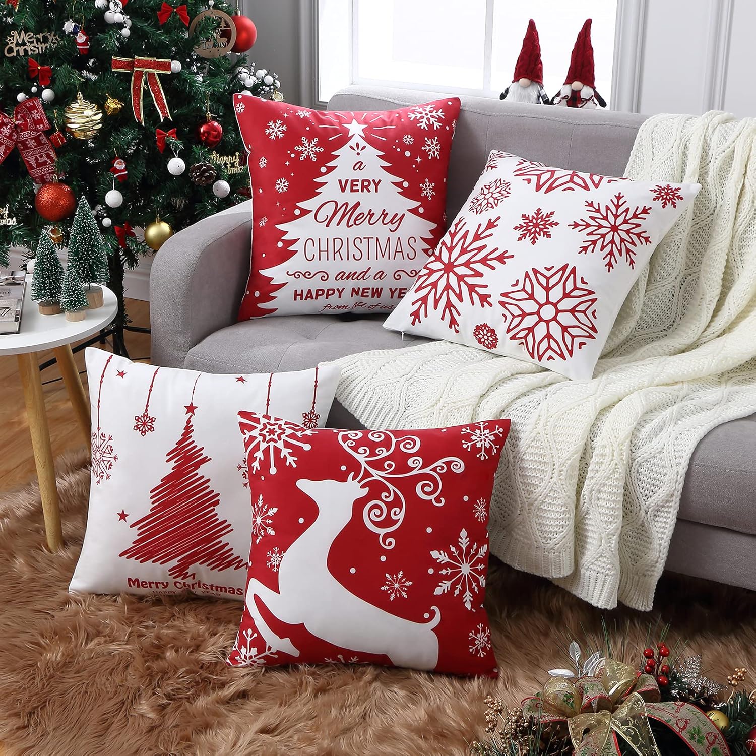 - π{Great Christmas Decor} With the holiday season just around the corner, giving your home that lovely Christmassy look with our christmas cushion covers 20x20 will get lots of compliments from your guests. These printed patterns, including a Christmas Tree, Elk, and βMerry Christmasβ letters, are specially designed for holiday parties and everyday entertainments. These red and white christmas pillow covers will effortlessly enhance your holiday decorations and create a festive atmosphere.
