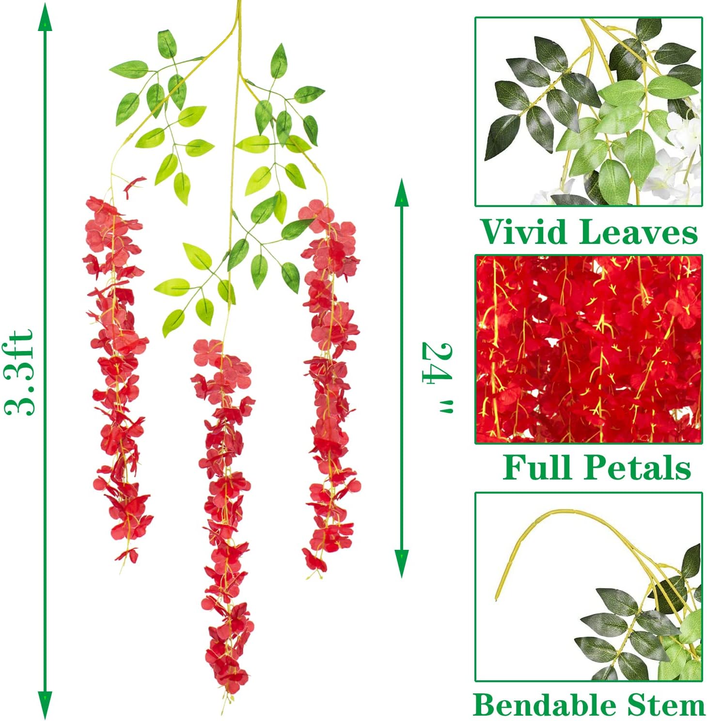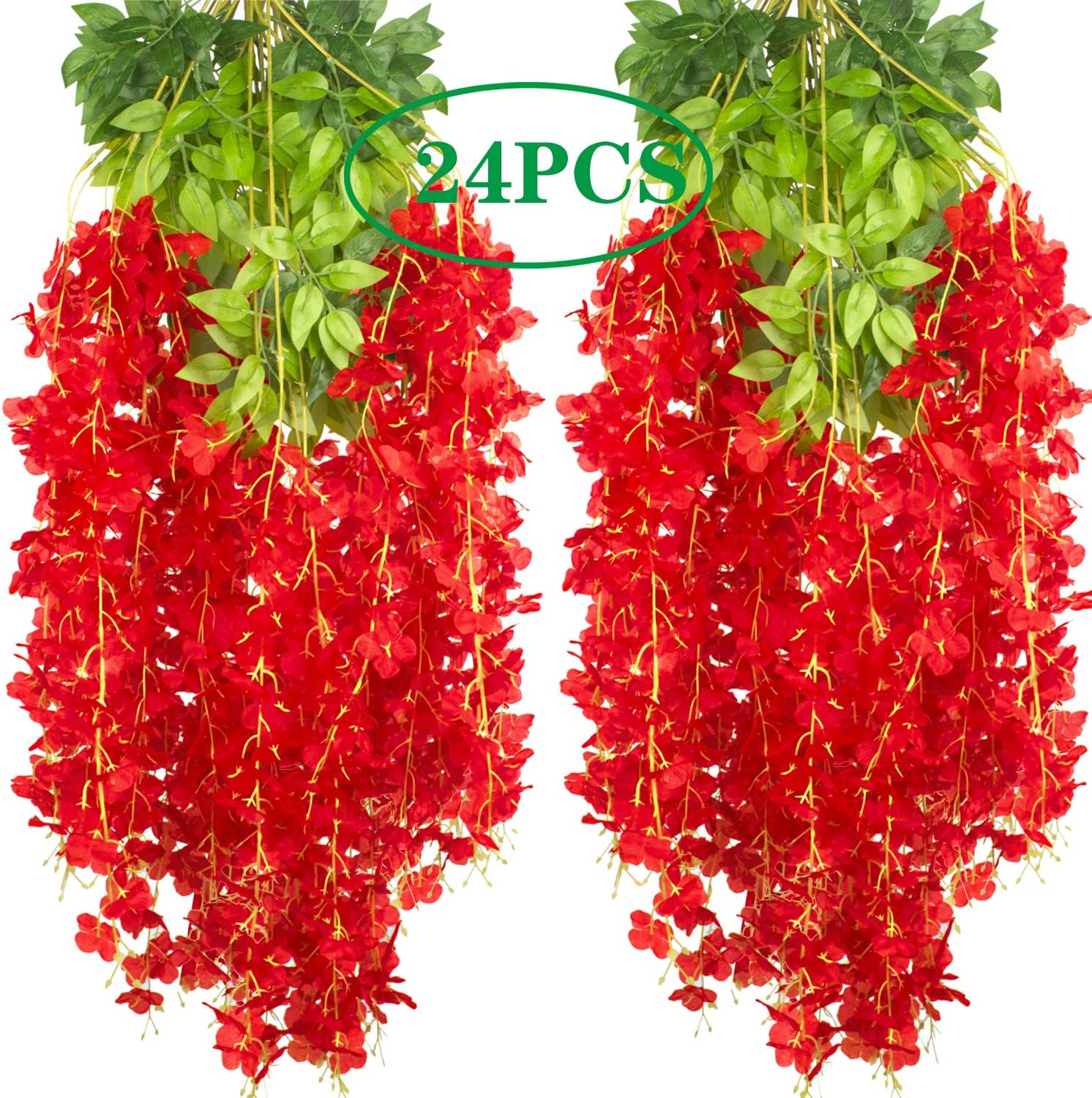 24 Pack Artificial Fake Wisteria Vine Ratta (3.75 Feet) Hanging Garland Silk Flowers String Home Party Wedding Decor (Red)
