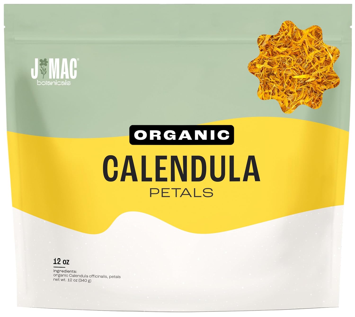 J Mac Botanicals, Organic Calendula Petals (12 oz) edible dried flowers petals, pairs well with edible dried rose petal, edible flowers for ice cubes, edible flowers for food, beverages, bath bombs