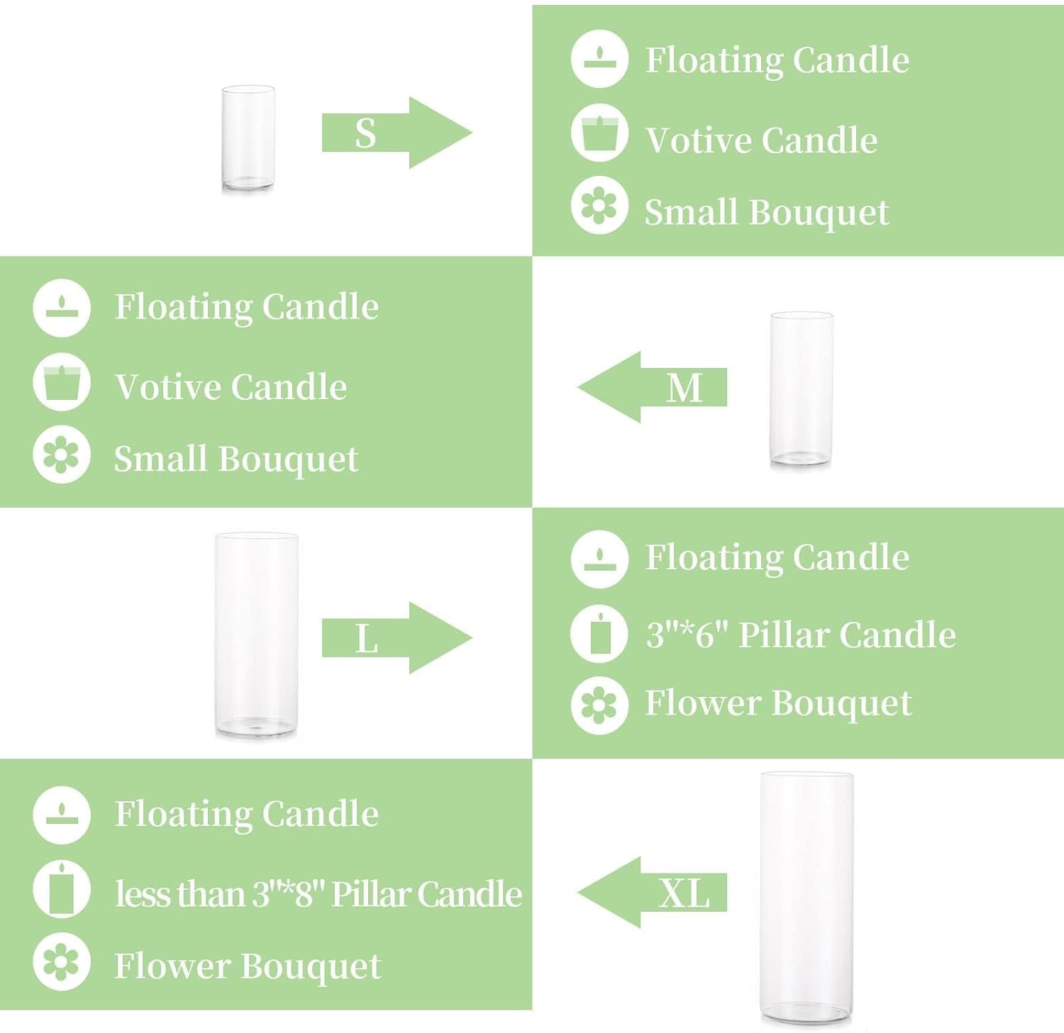 - Dual Purpose Candle Vases for Centerpieces: Large and medium sized glass vases work beautiful with 3'' pillar candles, 3'' floating candles and bouquet. Small size is for 2'' pillar candles, 3'' floating candles, votive candle, tealight candle and bud vase.