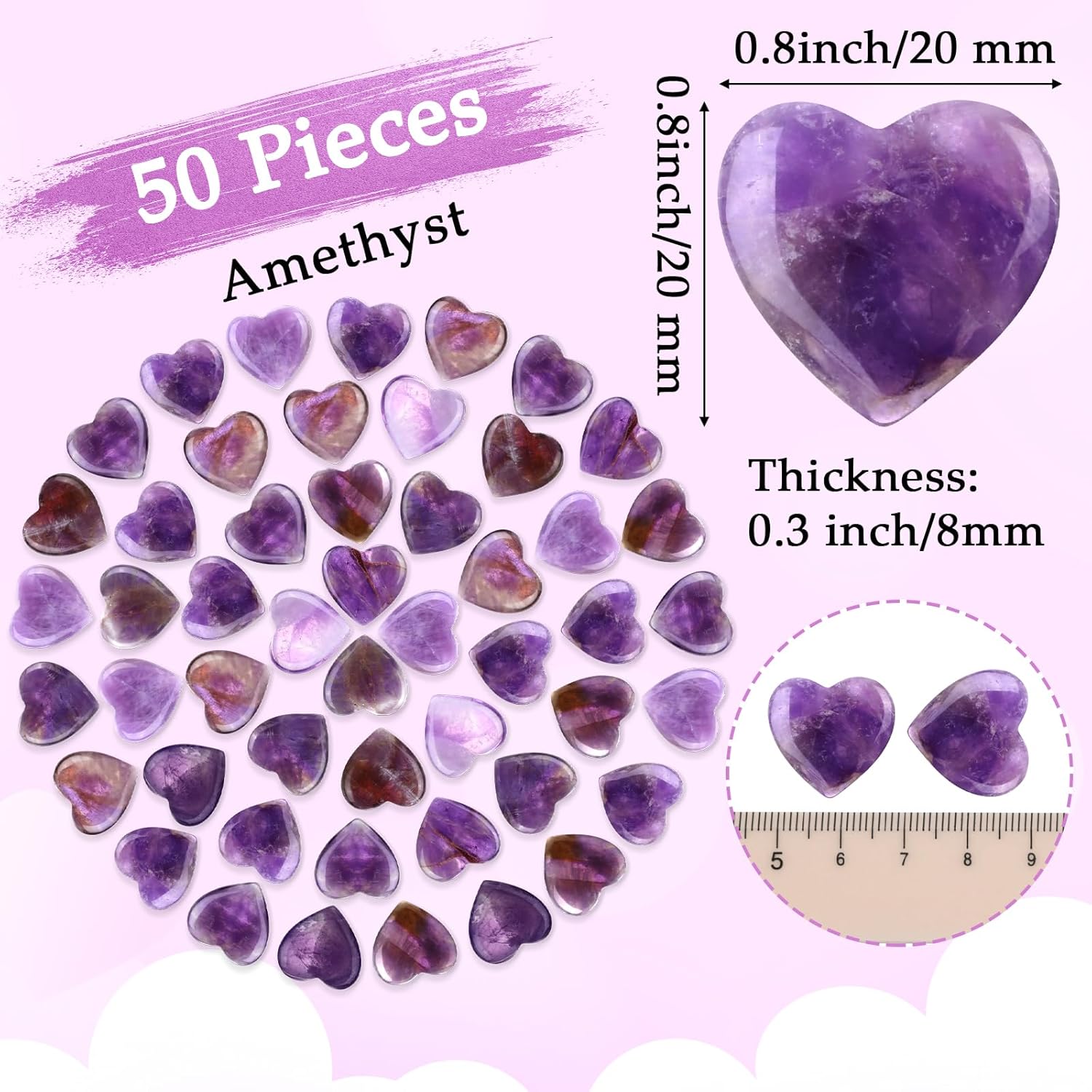 - Enough Quantity and Easy to Store: you will get a package containing 50 pieces of amethyst hearts, the size of which is about 0.8 inches/ 2 cm, it is the proper size for most people to use; When you're attending birthday party, weddings or other important occasions, you can use it to doctorate your earring and match your dressing