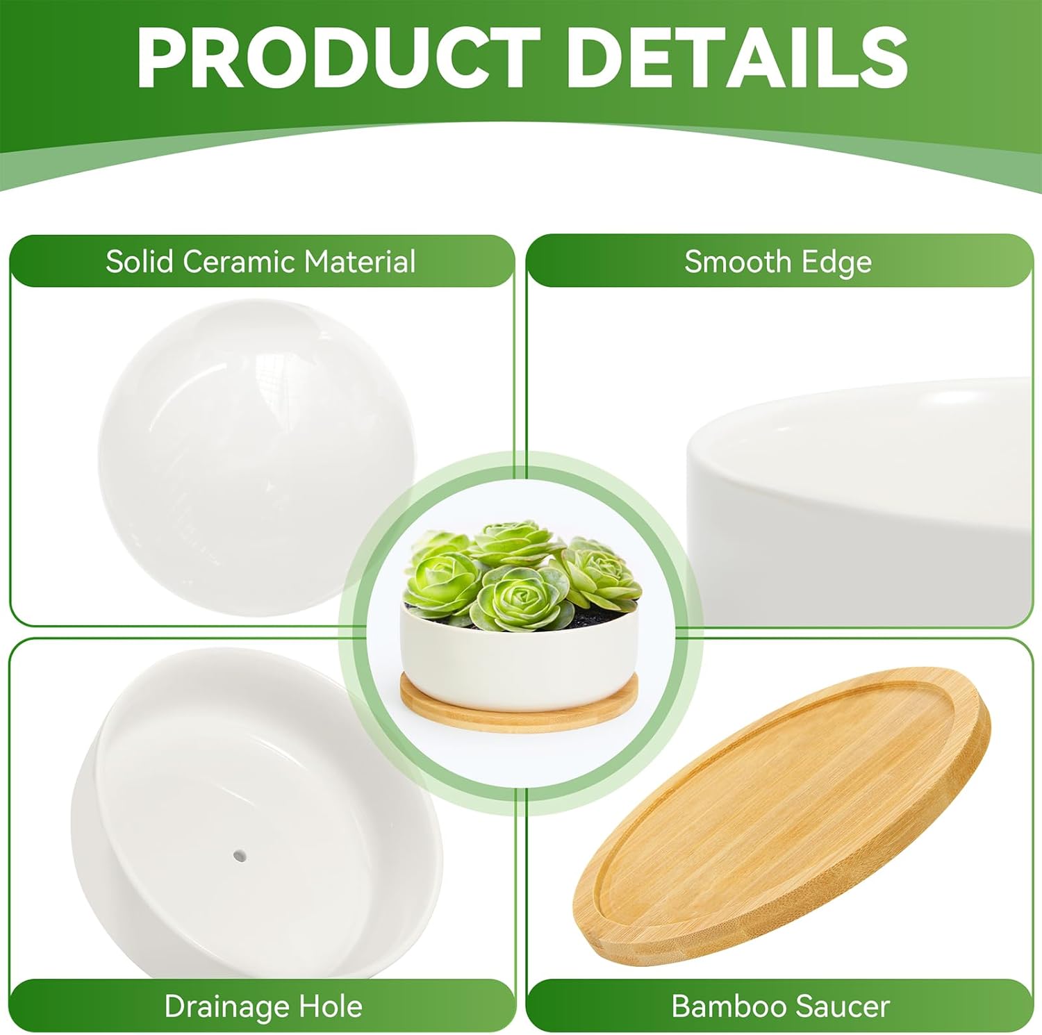 - Succulent Pots Great Value:2-pack round plant pots with drainage and bamboo tray are ideal for small greenery,succulents,cactus,herbs,or flowers.A great way to bring a touch of nature to your indoor spaces.(Plants not included)