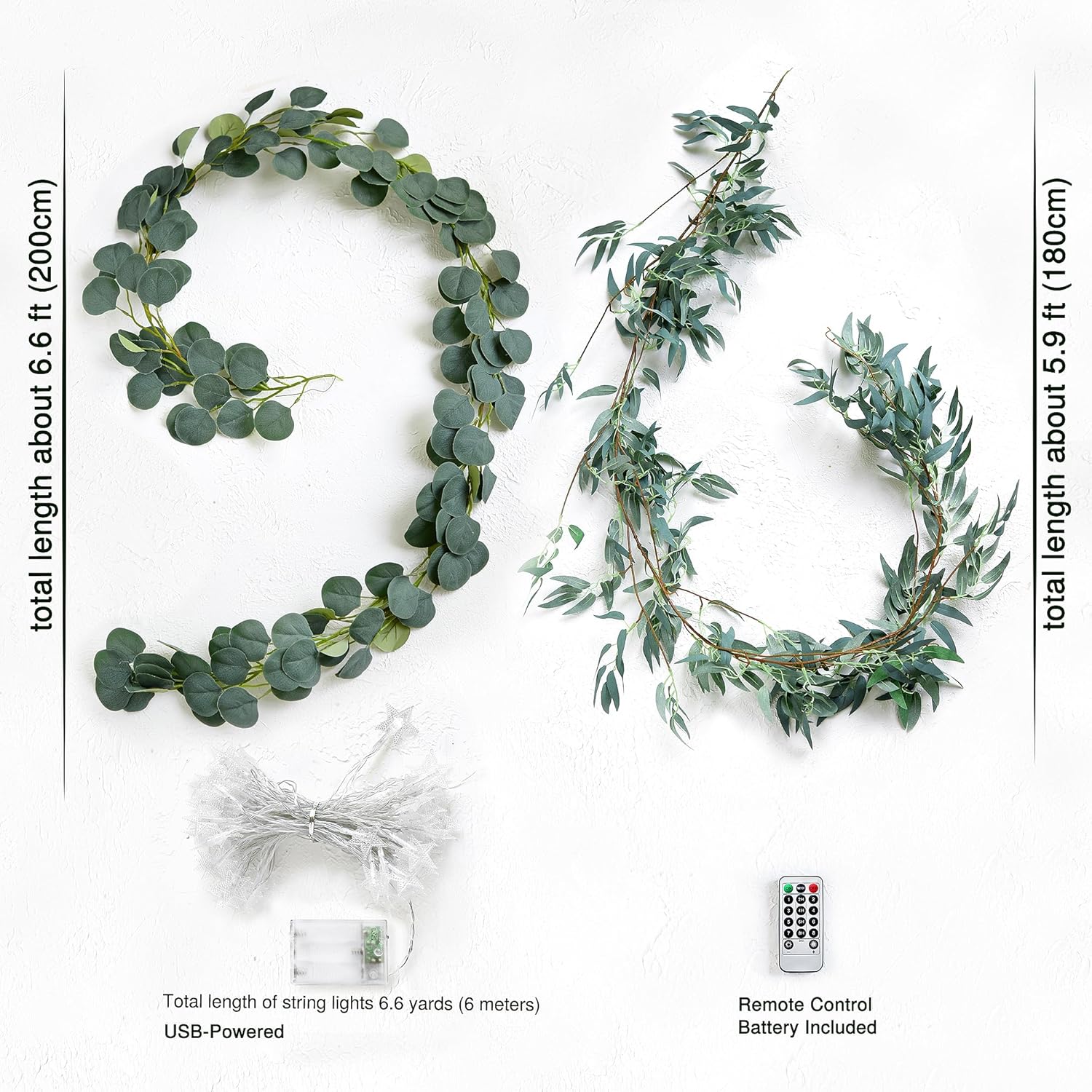 - Celebrate all year and all holidays with our harmonious pair of Willow and Eucalyptus Garlands. A fusion of two distinct natural worlds that come together to create a captivating tapestry of botanical beauty. The 6.6-foot Eucalyptus Garland, with its lifelike silvery-green leaves, intertwines gracefully with the 5.9-foot rustic Willow Leaf Garland, evoking a sense of whimsical elegance and serenity.