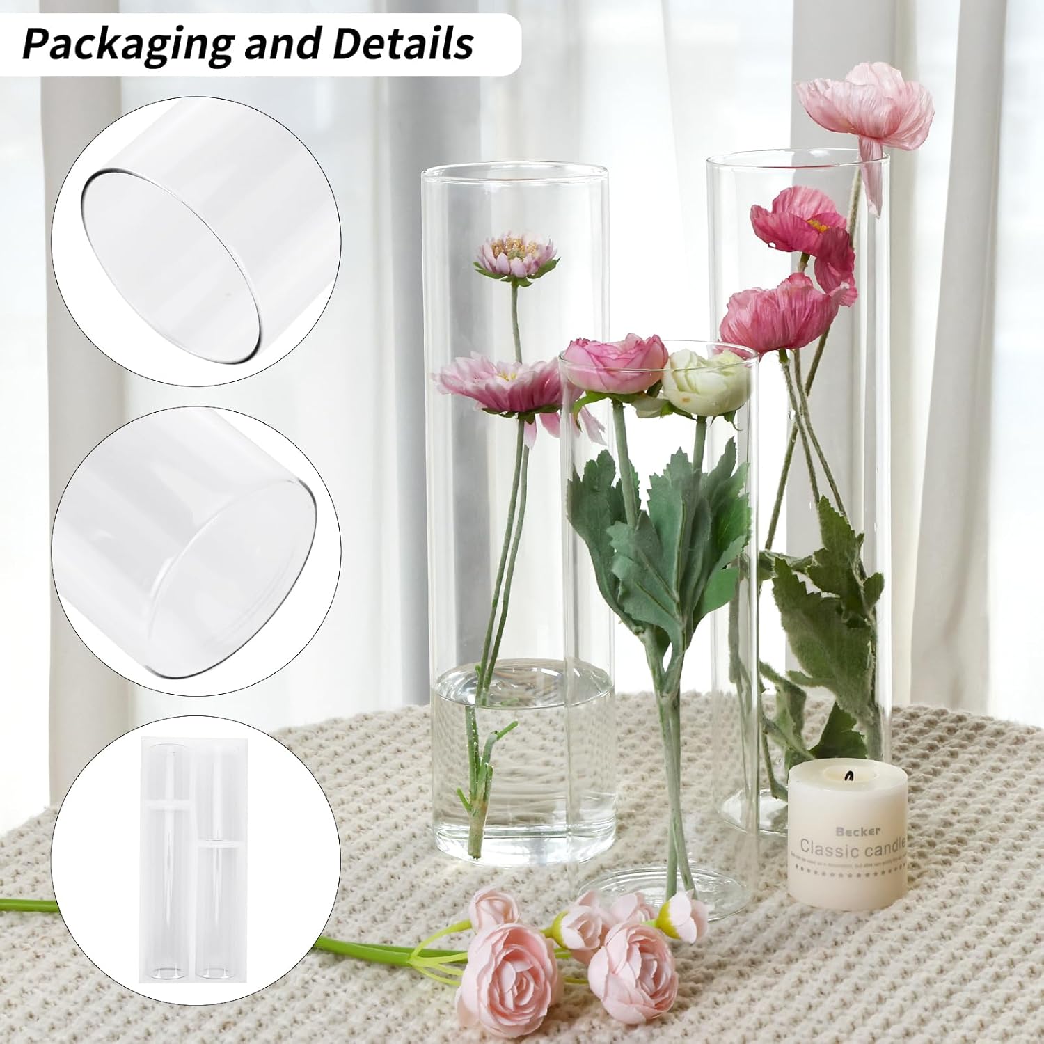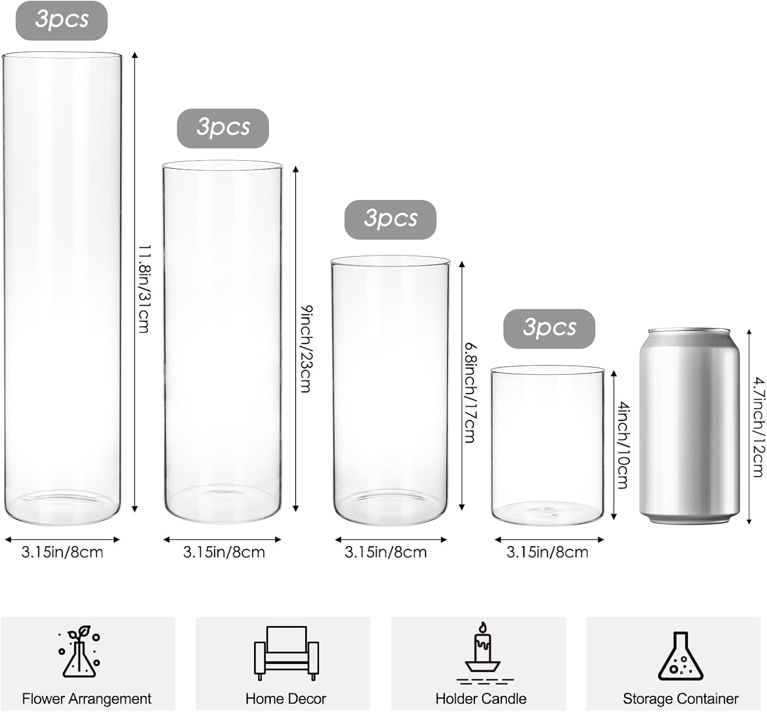 - Product contains: 12 glass cylinder vases, the diameter of the vases is 3.15 inches, and different heights are 4, 6.8, 9, and 11.8 inches, with 4 sizes for various combinations, the vase set is not only fit for flowers but also can used as floating candle holders. For reference, the smallest vase is about the same size as a beverage can, perfect for floating candles, while the taller vase is more suitable for bouquets.