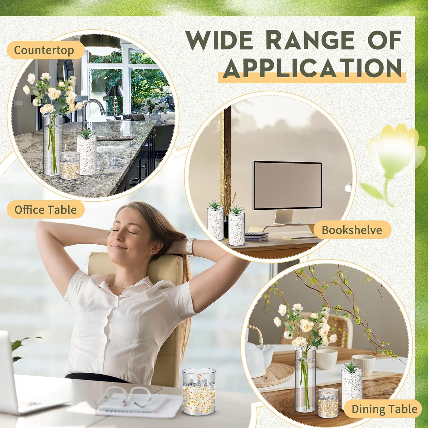 - Transparent Cylinder Design: the clear and transparent design of these wide vases allows for a beautiful and unobstructed view of the contents within, enhancing the visual appeal of your floral arrangements or candle displays; The sleek cylindrical shape adds a modern touch to any setting, making it an ideal choice for both casual and formal occasions