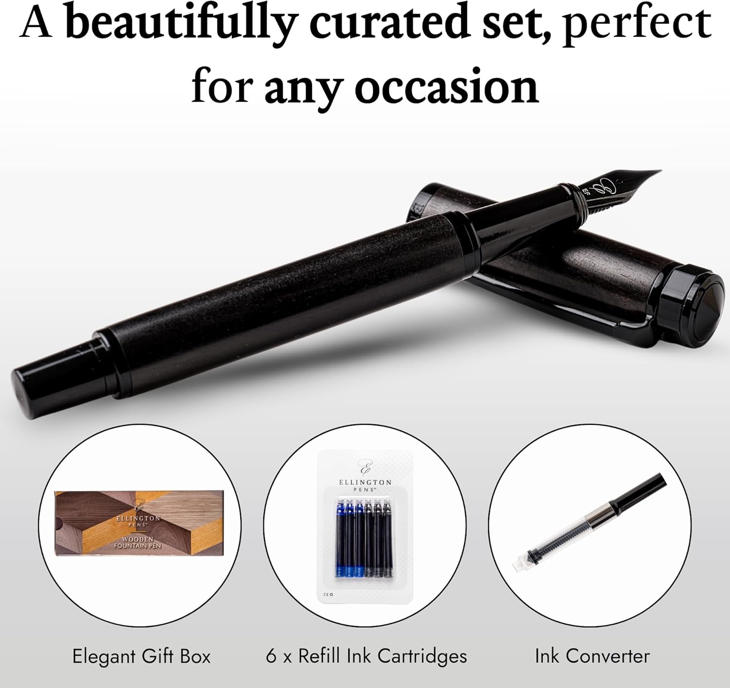 Ellington Pens Elegant Wood Fountain Pen Set ā Includes Wooden Pen Box, Ink Converter, 6 Ink Cartridges, and Gift Box ā Writing, Calligraphy