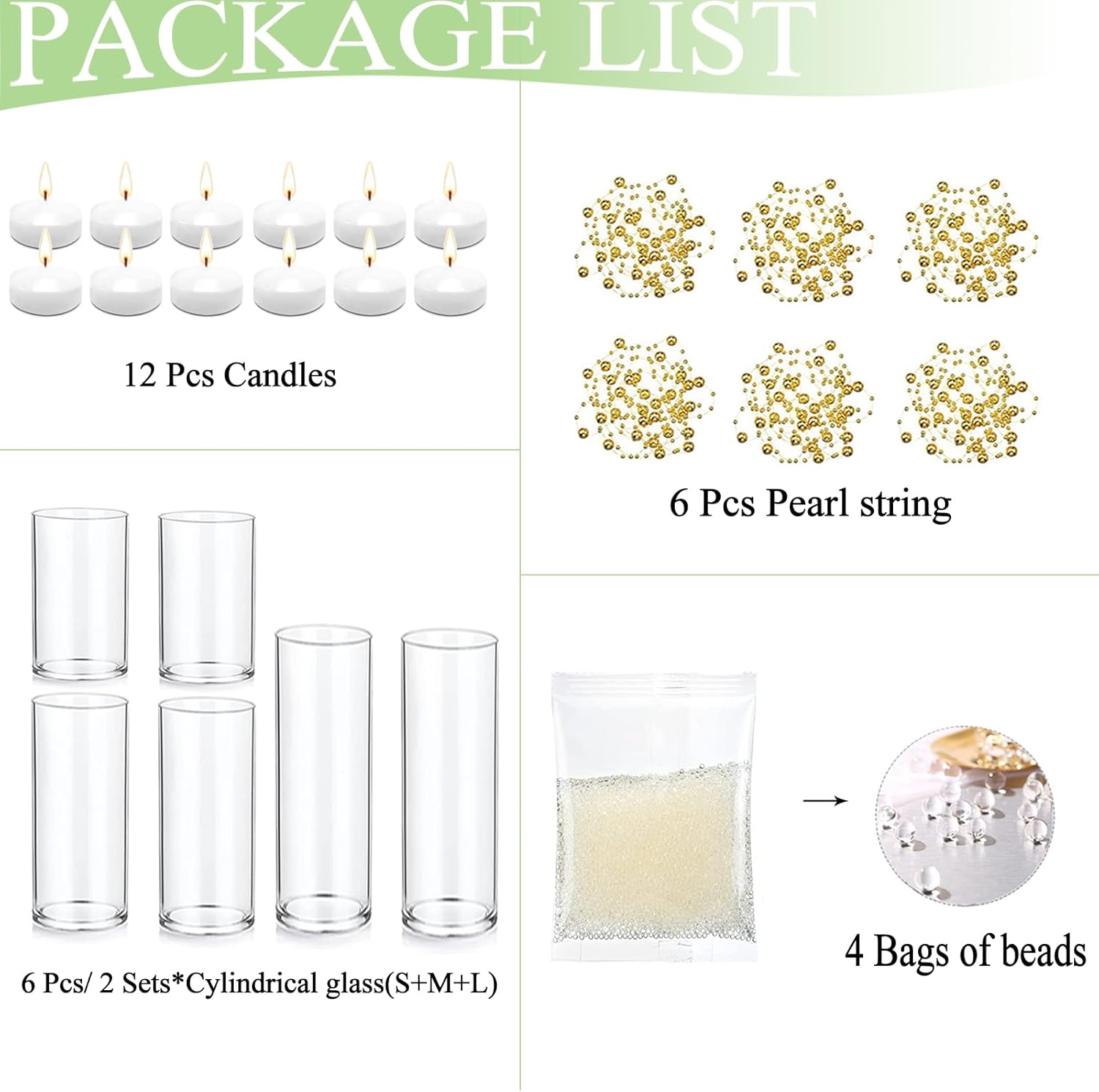 - Size Details: The glass vases come in three different sizes, 2.56" x 5", 2.56" x 6", 2.56" x 8", the size of the floating candle is about 1.87"x 0.77"; And each Artificial Pearl string is approx. 51.18" in length