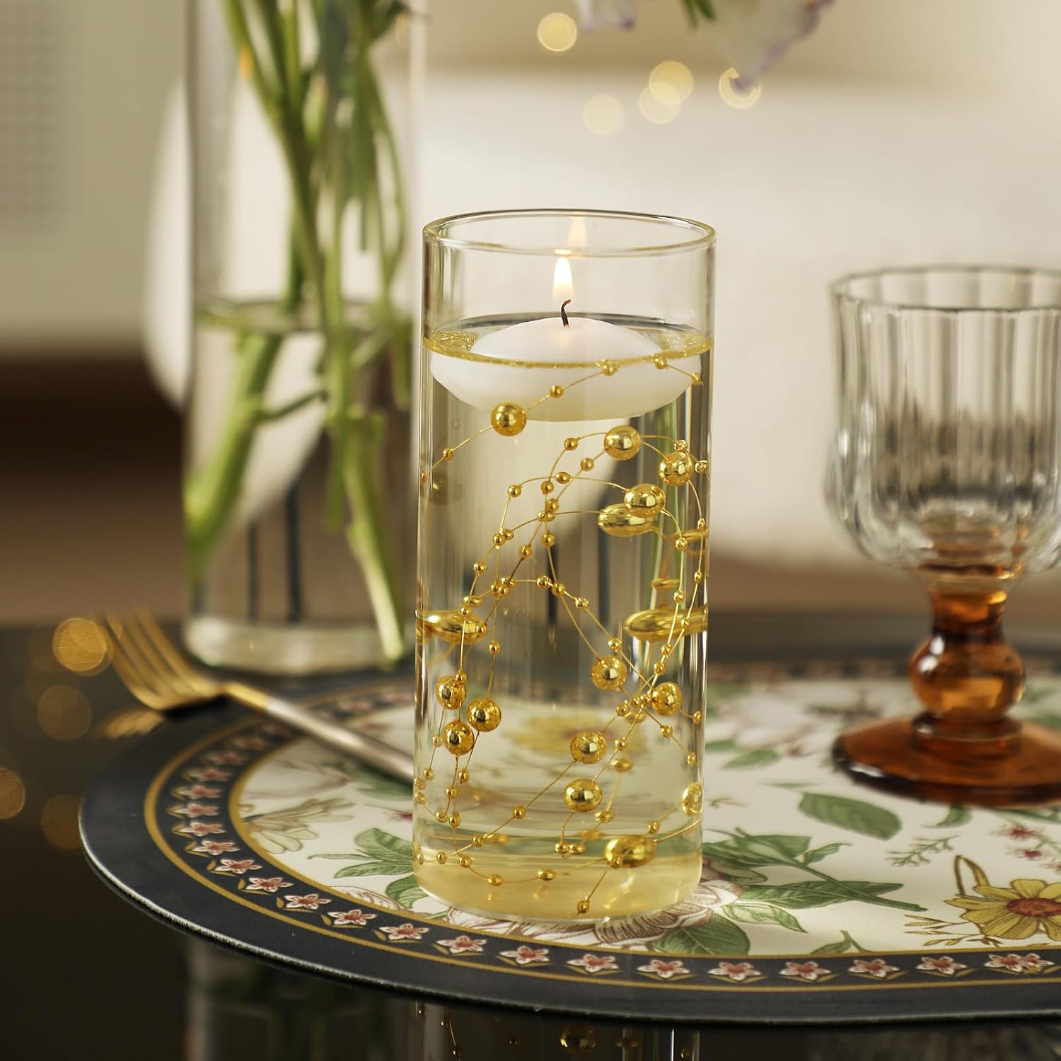 - Easy to Operate: Put the pearls strings into the glass cylinder vase,and then place floating candles on the water and light up to get a delicate and beautiful desktop center decoration