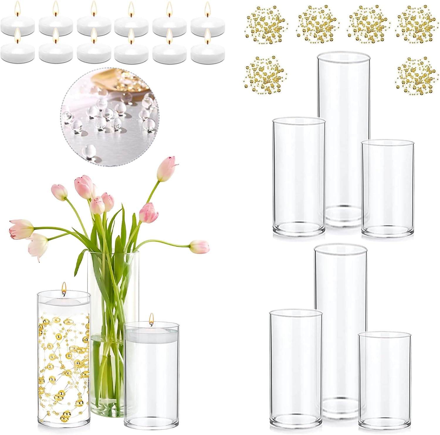 - Package Includes: You will receive 6 glass cylinder vases in 3 sizes, 2 of each size, 12 white floating candles, 6 pearl string, which can be put into use separately or in combination to meet your daily use and replacement demands