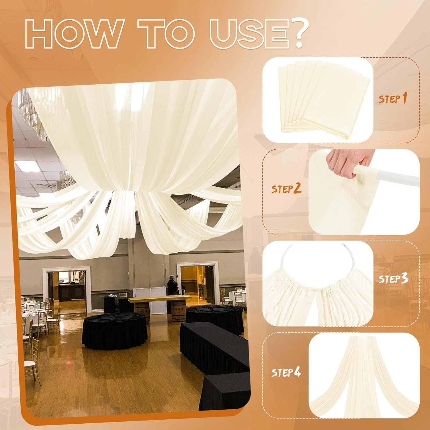 - 👑【Package Includes】You can get 6 panels Ivory wedding Ceiling Drapes (without hanging pieces). Each wedding extra long curtain measure for 5 feet width X 30 feet length. Enough quantity to meet your needs for decorating weddings, parties and decorating your wedding with romantic Ceiling Drapes will definitely bring you unexpected surprises.