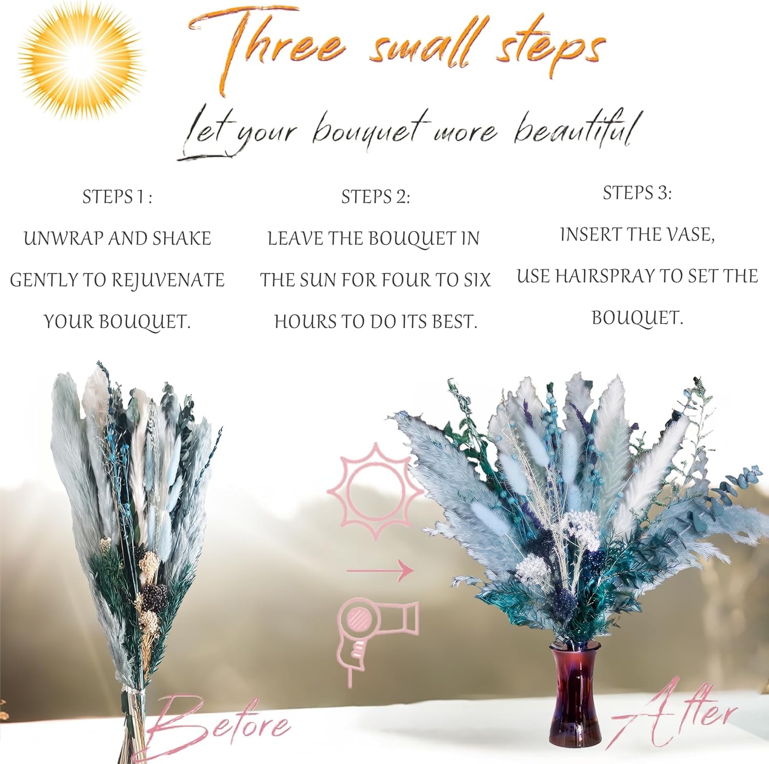- - Instructions for use: dried blue flowers will become fluffy after being exposed to the sun for 3-5 hours. Insert blue flower arrangements into a vase filler and spray it with hairspray to preserve it longer. The dried pompas floral vases shown is not included in the package.