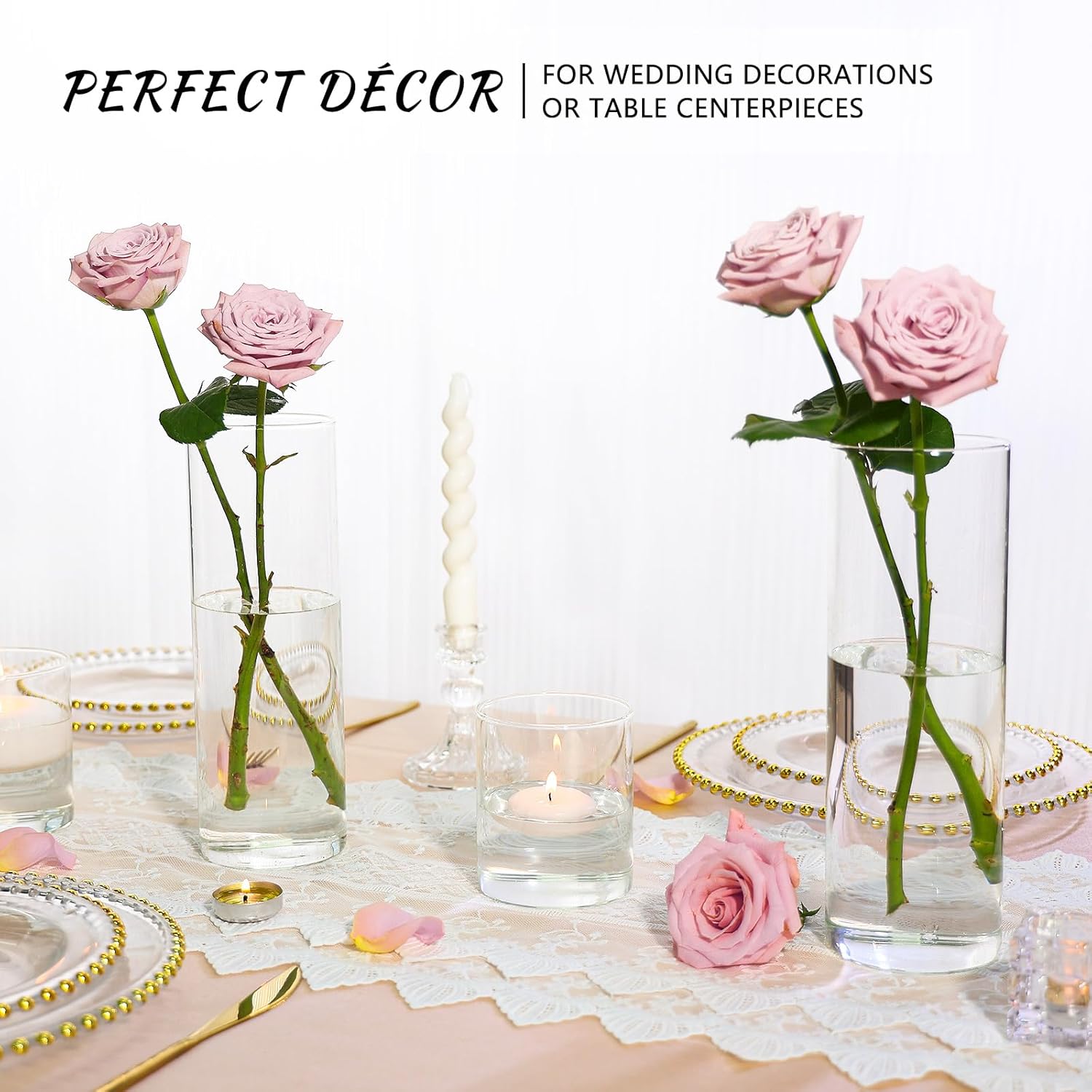 - Versatile Applications: This tall cylinder vases bulk excel as exquisite table centerpieces, elegant glass candle holders, and enchanting wedding decorations. Their universal appeal makes them an ideal choice for a wide range of occasions, including restaurants, gardens, weddings and parties.