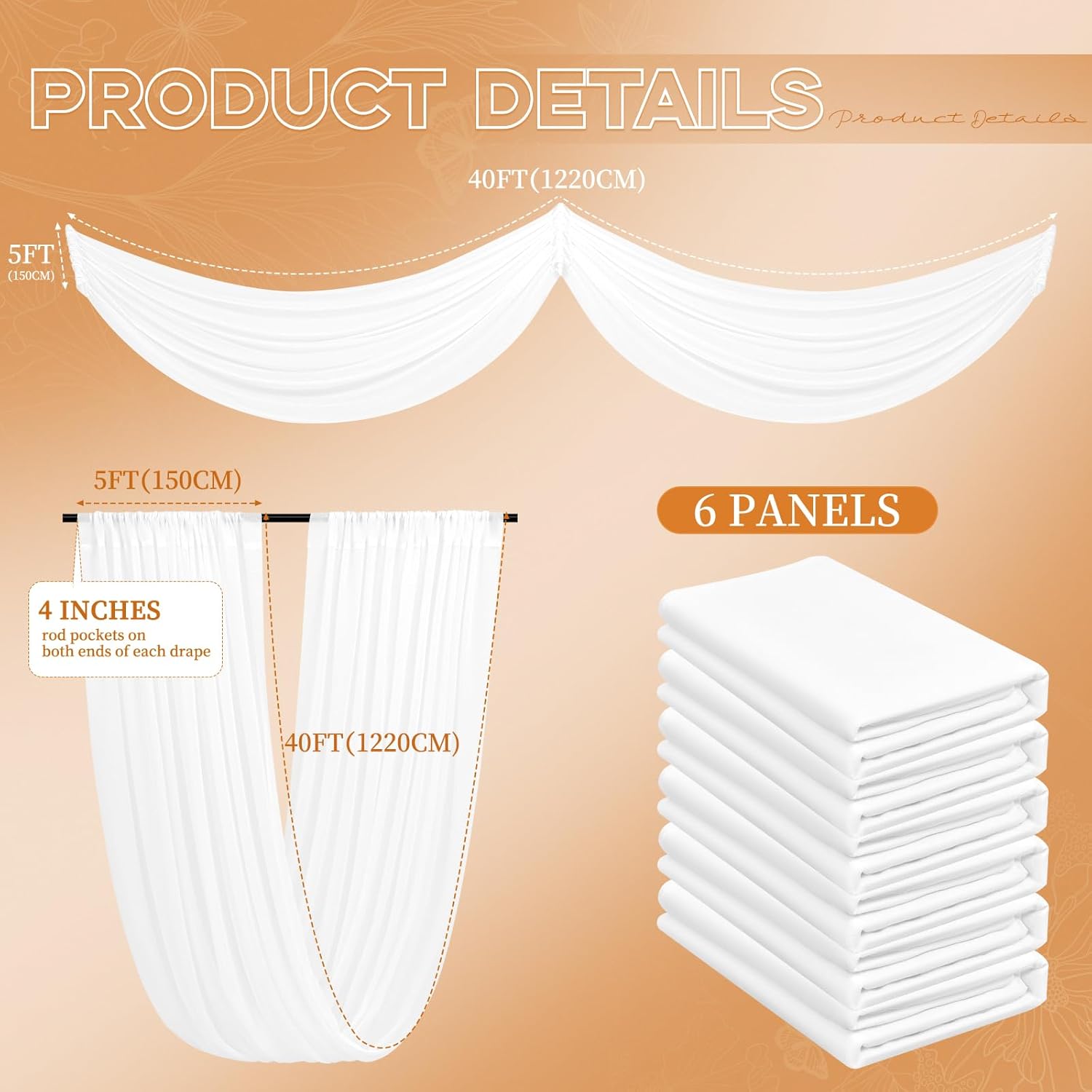 - 👑【Package Includes】You can get 6 panels white wedding Ceiling Drapes (without hanging pieces). Each wedding extra long curtain measure for 5 feet width X 40 feet length. Enough quantity to meet your needs for decorating weddings, parties and decorating your wedding with romantic Ceiling Drapes will definitely bring you unexpected surprises
