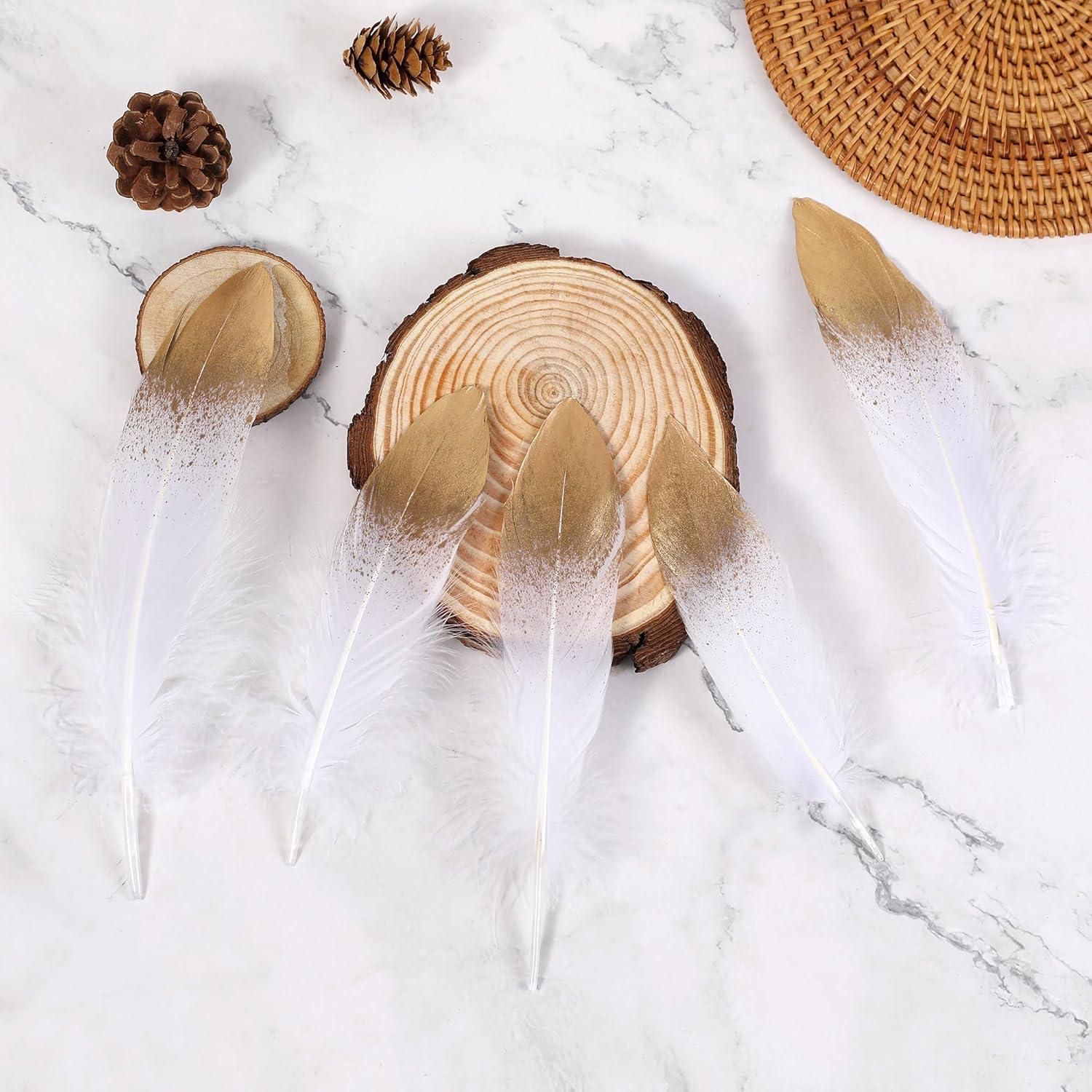 Larryhot Dipped Gold & White Goose Feathers for Crafts - 6-8 inch 60 pcs Natural Feathers for Wedding Party Decorations,DIY Crafts and Table Centerpiece(Gold & White)