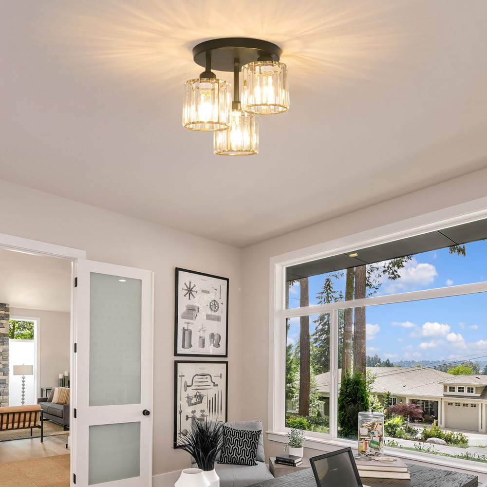 - 【Semi Flush Mount Ceiling Light】: The crystal ceiling light is unique open design ensures that light is distributed evenly. Black metal frame with clear crystal shades create a wonderful glow to illuminate your space with some appealing style