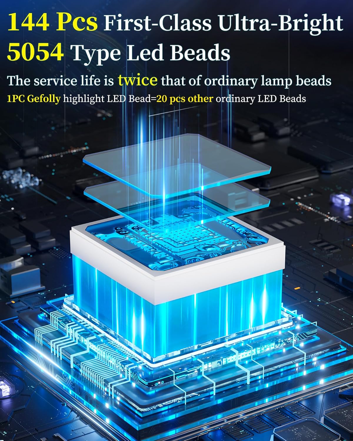 - [Ultra Bright 5054 Type Led Beads] - Designed with 144pcs first-class super bright 5054 type LED beads, 1 of our Gefolly beads is as bright as 20 ordinary beads. The lighting area is up to 4200 square feet, reducing lighting blind spots. Escort for the safety of you and your family. The first choice for night lighting.
