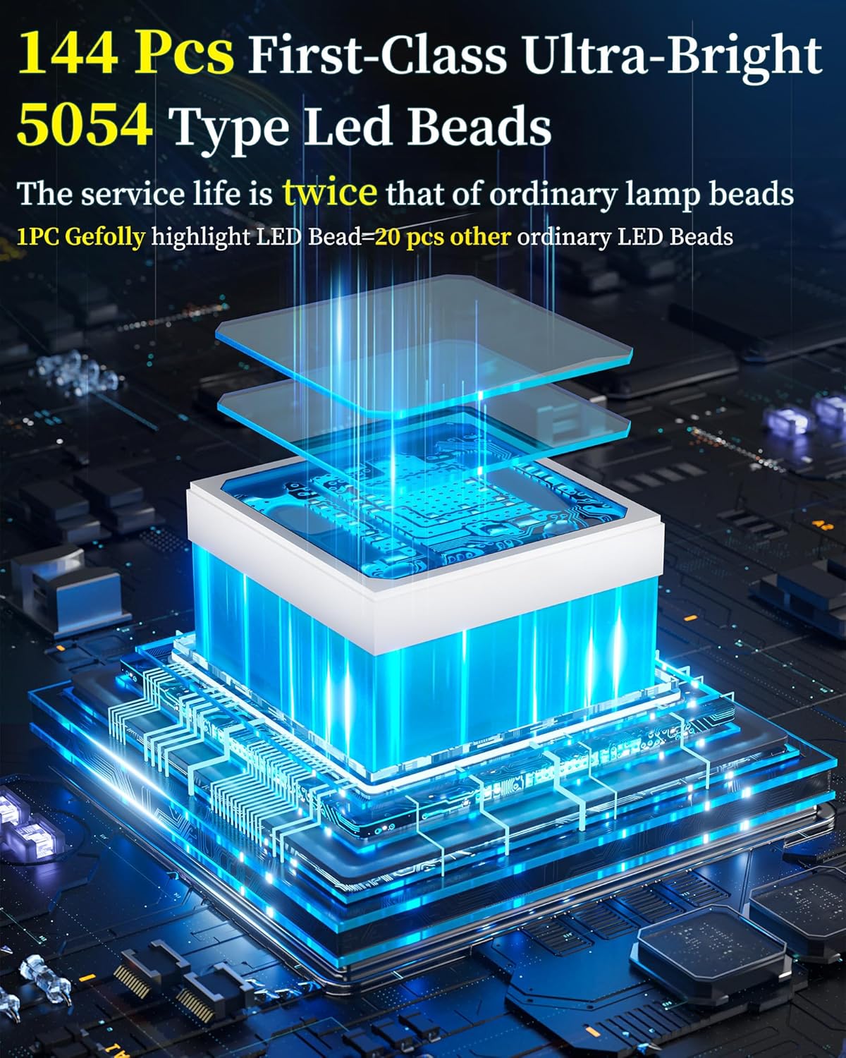 - [Ultra Bright 5054 Type Led Beads] - Designed with 144pcs first-class super bright 5054 type LED beads, 1 of our Gefolly beads is as bright as 20 ordinary beads. The lighting area is up to 5000 square feet, reducing lighting blind spots. Escort for the safety of you and your family. The first choice for night lighting.