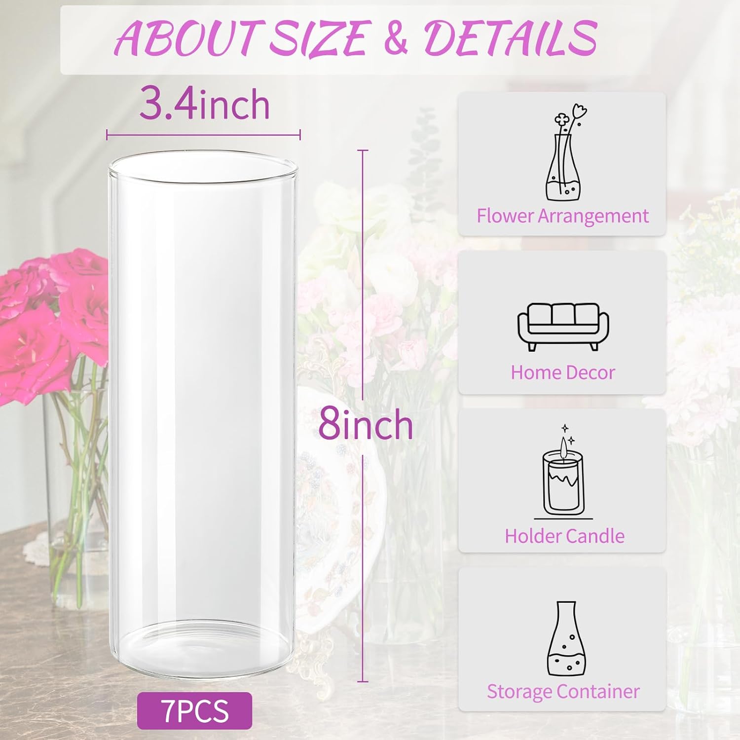 - Product Details: Include 7pcs glass cylinder vases for centerpieces, each of exquisite glass vase measures 8" H x 3.4" W, the cylinder vases are suitable for flower arrangement, columnar candlesticks, floating candlesticks, as well as storage containers and central decorations filled with gemstones or lamps.