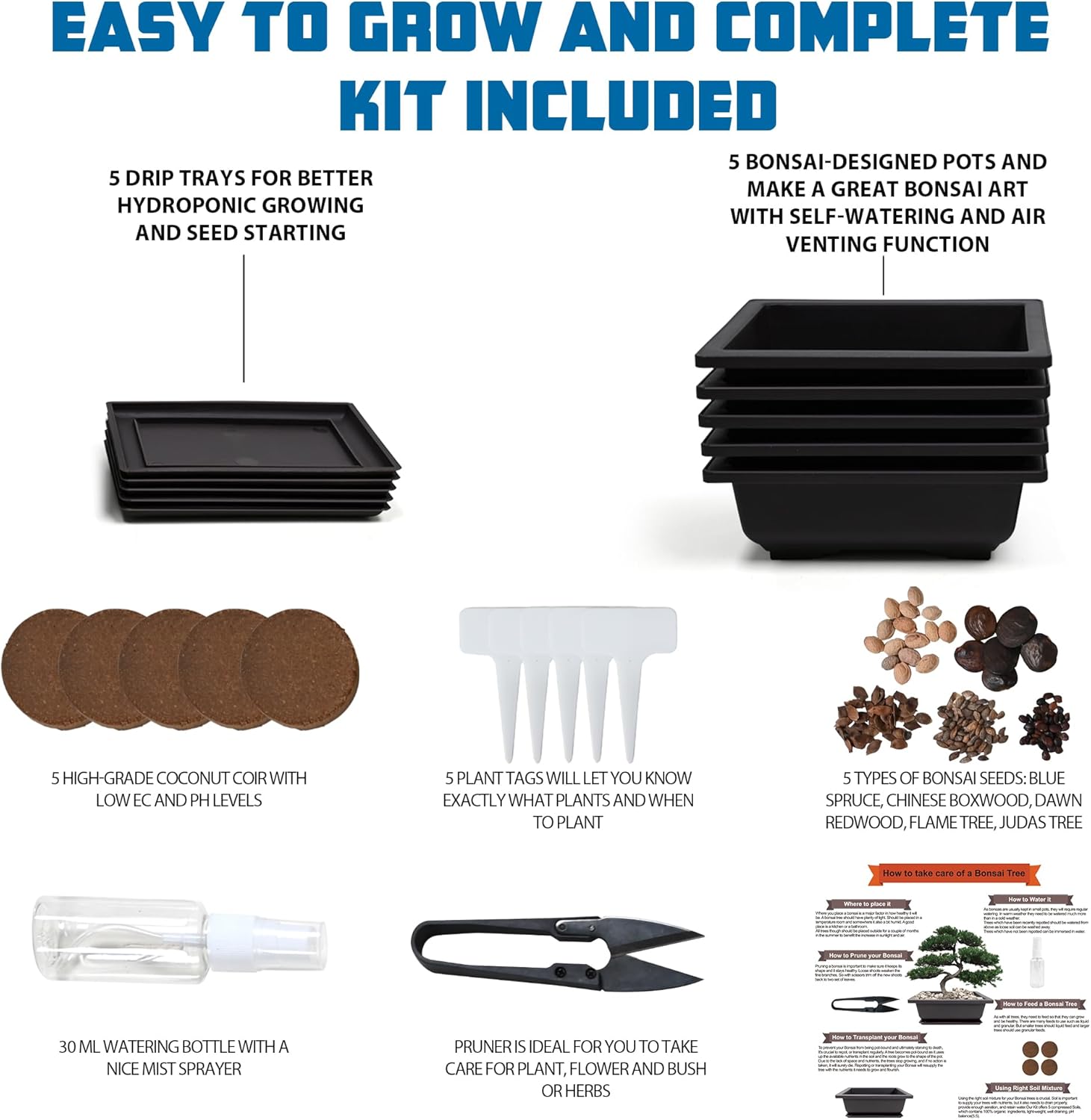 - KIT INCLUDES: 5 types of bonsai tree seeds, 5 plastic pots with drip trays, 5 soil discs, 5 plastic writable plant markers, 1 bonsai pruner, a mini tweezer, a small water bottle and a gardening guide.