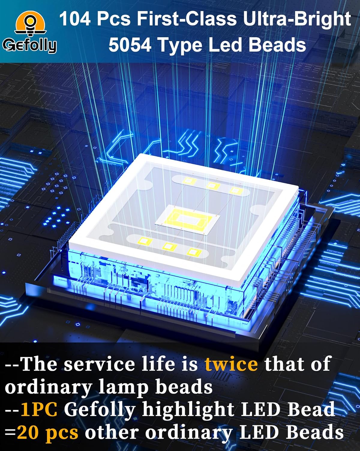 - [Ultra Bright 5054 Type Led Beads] - Designed with 104pcs first-class super bright 5054 type LED beads, 1 of our Gefolly beads is as bright as 20 ordinary beads. The lighting area is up to 4000 square feet, reducing lighting blind spots. Escort for the safety of you and your family. The first choice for night lighting.