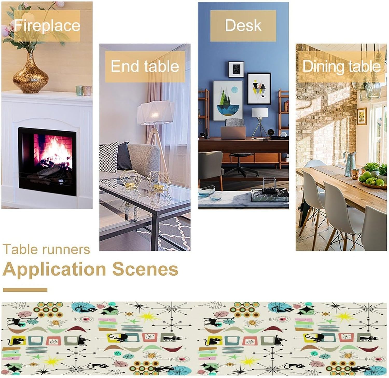 Colorful Geometric Table Runner,Vintage Mid Century Cute Cat Abstract Morden Print Tablecloth Burlap for Hotel Indoors Outdoor Dining Room Kitchen Home Decor, 13x36in