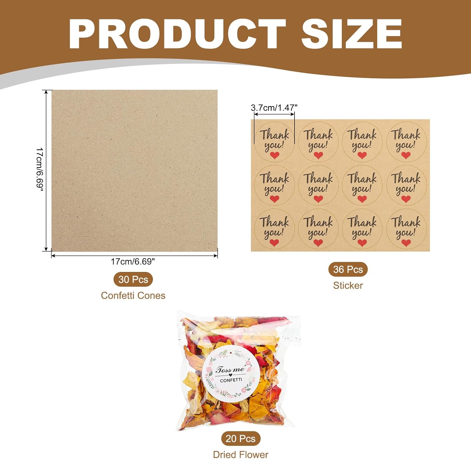 - Material: Paper; Color: Red/Yellow; Paper Cone Size: 17 x 17 cm / 6.69 x 6.69 inch (LxW); Sticker Diameter: 3.7 cm / 1.47 inch; Dried Flower Weight: 160 g / 3.4 qt / 5.75 oz; Package List: 30 Pcs x Confetti Cones, 20 Pcs x Dried Flower, 36 Pcs x Sticker
