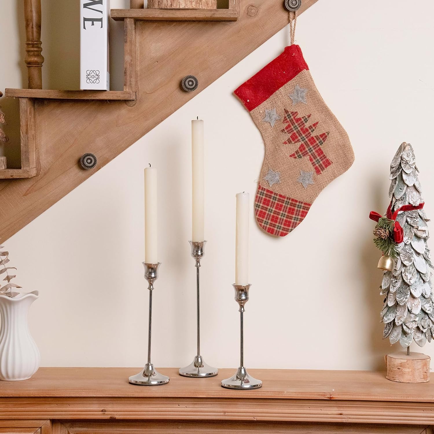 - [Wide Applications]: The silver taper candle holders set is suitable for candlesticks and taper canldes with O.D 0.78inch(20mm). They can be placed in bedroom, living room, bar, dining tables,side endtable, or coffee tables to create a family atmosphere for romantic weddings, holiday decorations, ceremonies, and anniversaries.se it as a centerpiece on your table or fireplace decorations