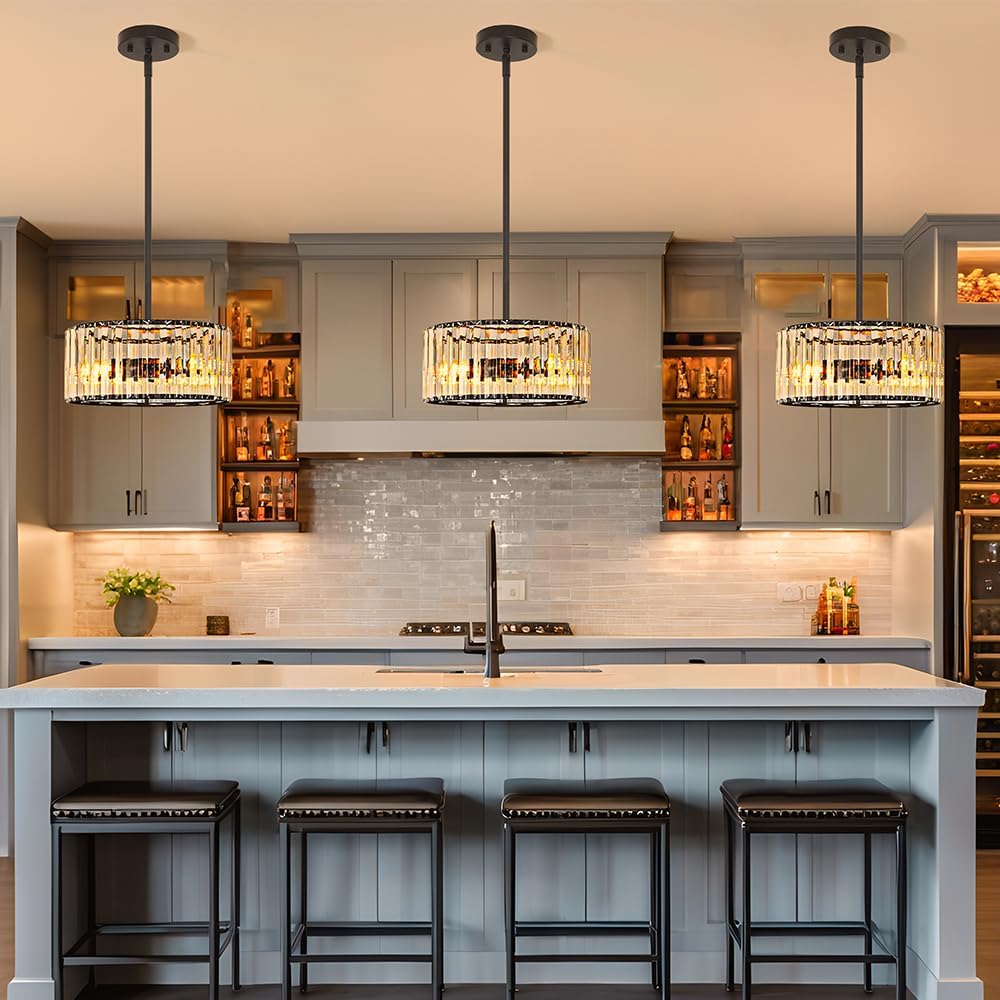 - Black Crystal Pendant Ligth: Lxybcce modern crystal dining room chandelier features a black metal frame adorned with clear crystals. The open-bottom design puts out plenty of light to illuminate your space and makes it easy to replace the light bulb