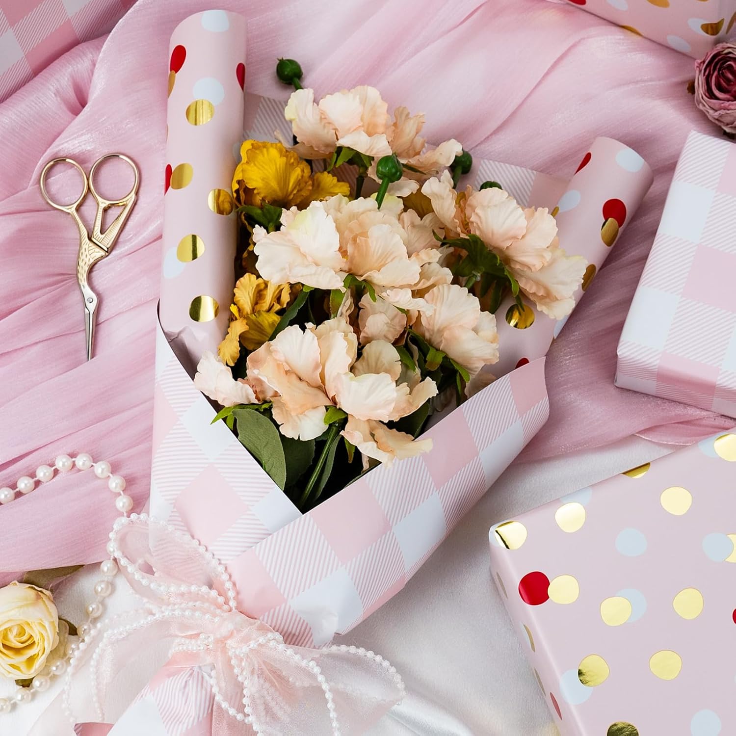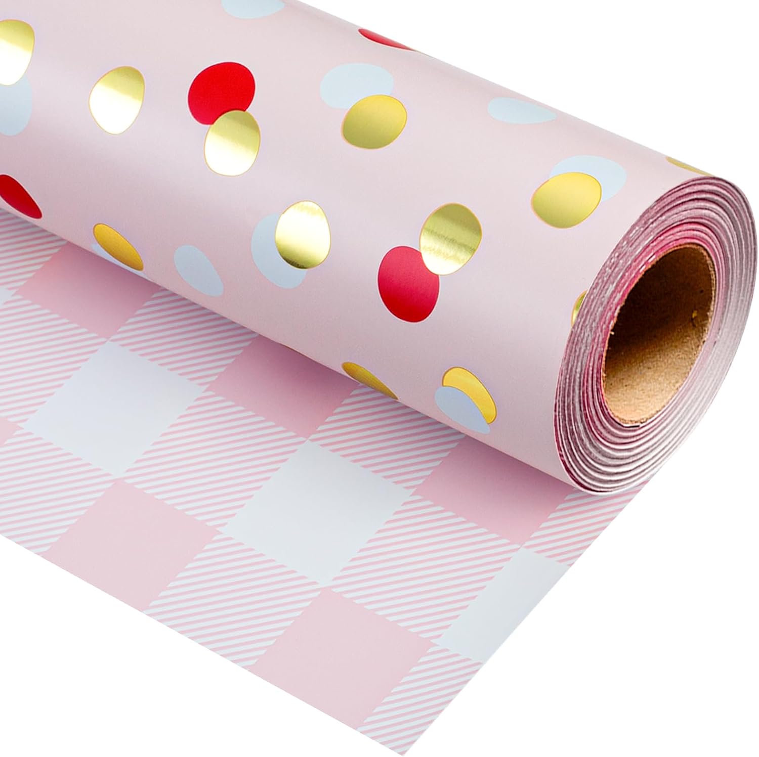 - Double-sided wrapping paper: One side is a white gold red polka dot pattern with a pink background, and the other is a pink check to make your gift wrapping fun and cute