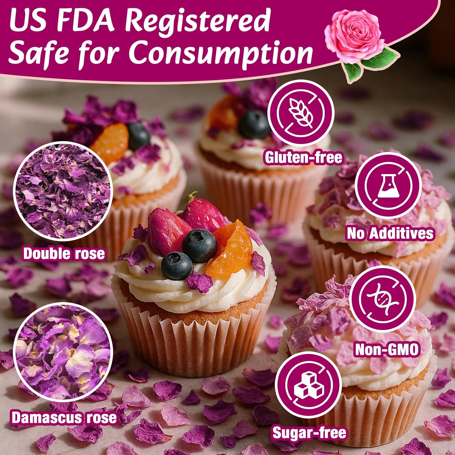 Fangkic Edible Rose Flower Petals for Cake, 2-Pack-0.5oz Each, 3AAA Food Grade Dried Double rose and Damascus Rose Flower Sprinkle for Baking, Cocktails, Tea, Soap –Gluten-Free, No Additives