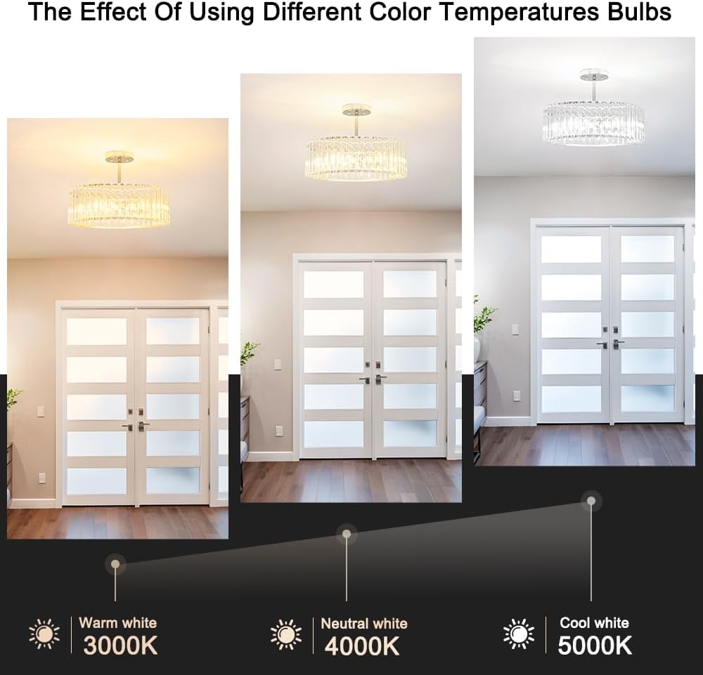 - 【Semi Flush Mount Ceiling Light Design】The ceiling light fixture features unique clear crystal shade and modern style chrome metal base. The open-bottom design delivers bright even illumination and makes it easy to replace the light bulb, makes this modern crystal chandelier simple and luxurious yet sophistication