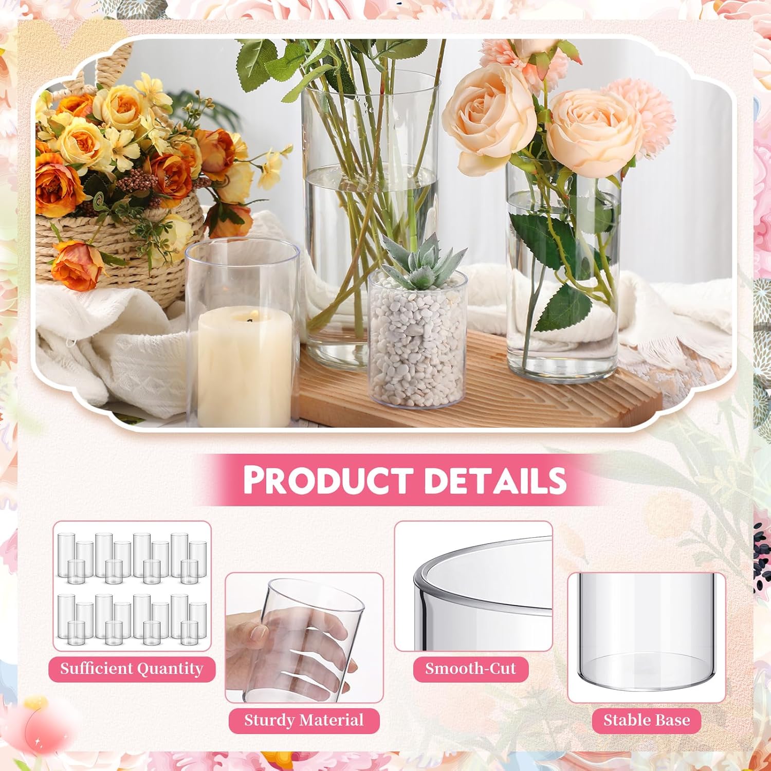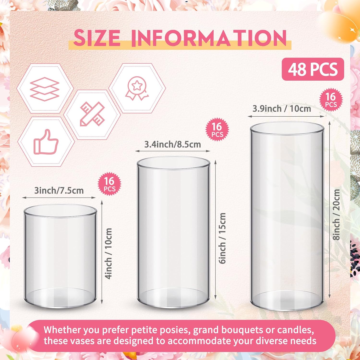 - Abundant Quantity: with 48 clear cylinder vases included in the package, you'll have an ample supply for your floral arrangements or decorative displays; Whether you're organizing a large event or simply enjoy regularly refreshing your room decor, this set provides the quantity you need to effortlessly adorn multiple spaces