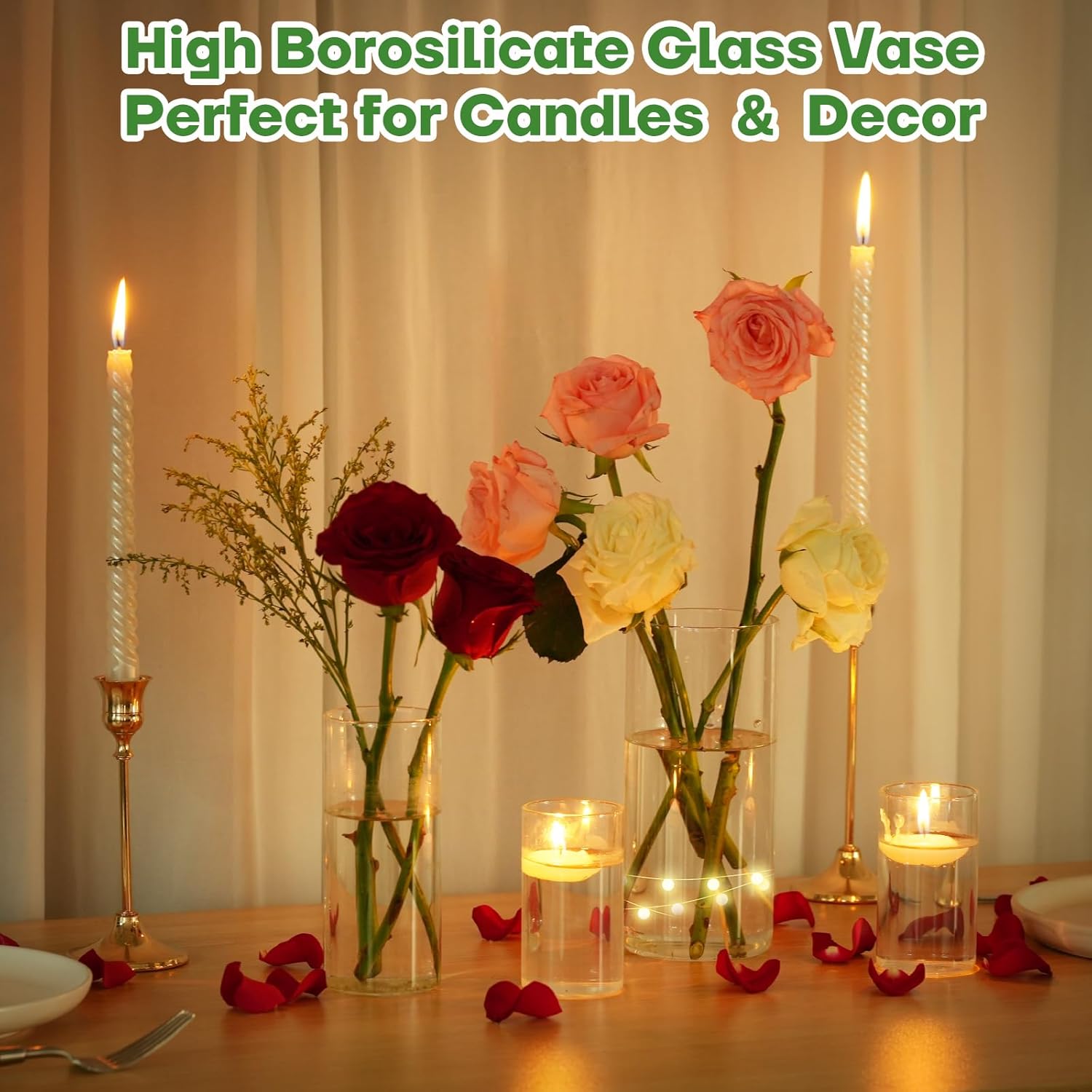 - Candle-Specific Functionality:These glass cylinder candle holders shine as versatile candle vases—perfect as floating candle vases and cylinder vases for floating candles, with sizes (4/6/7.5/10 inch) tailored for both small tealights and medium pillar candles. Crafted from heat-resistant borosilicate glass, they double as safe hurricane vases to shield flames, making them ideal floating candle holders for cozy evenings. The clear design amplifies glow, whether using pillar candles in glass cylinders or floating candles centerpiece set—ideal for date nights, holiday gatherings, or ambient home decor
