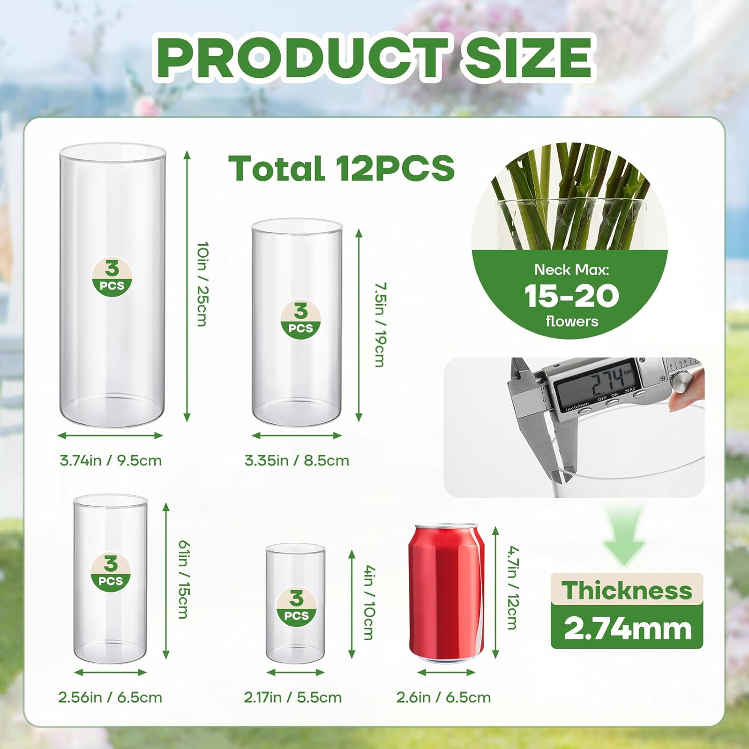 - 12PCS 4-Size Glass Cylinder Vases for Centerpieces: This set includes 12 clear glass cylinder vases in 4 sizes (4"H x 2.2"W, 6"H x 2.6"W, 7.5"H x 3.3"W, 10"H x 3.7"W), with 3 of each size, offering 3 different sized cylinder vases perfect for diverse needs.:flower arrangement,candle vases ((such as floating candle vases or pillar candles in glass cylinders),wedding,home decor,party,office desk decor and more