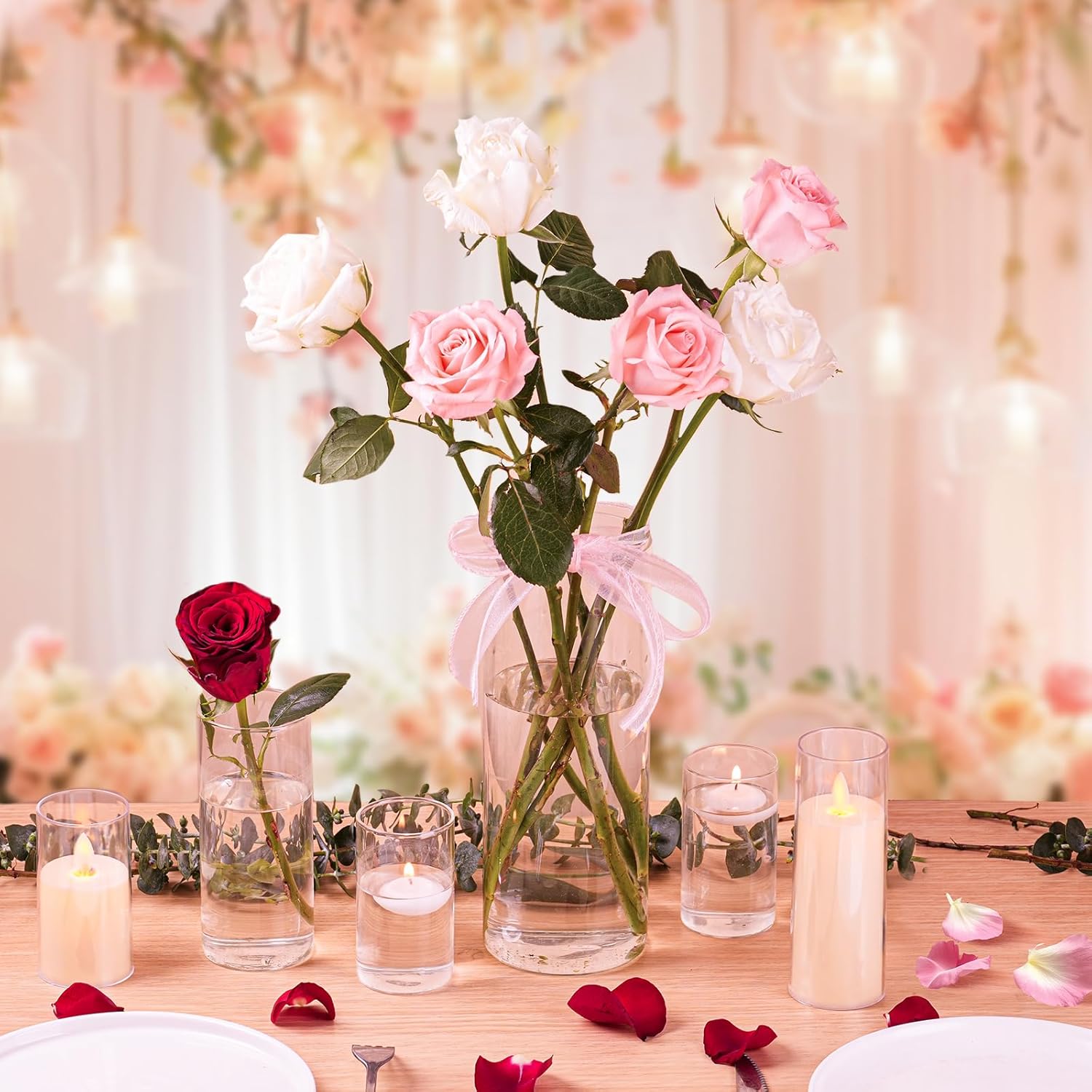 - Wedding Decoration:These 12-piece bulk wedding vases (4 different sizes) are essential table centerpieces. Versatile clear cylinder vases shine in any setting: 10-inch tall vases stand as focal points with long-stem roses; 7.5-inch adds mid-height charm; 6-inch holds floating candles; 4-inch small vases tuck into arrangements. Perfect for rustic barns, beachfront pavilions, or modern ballrooms